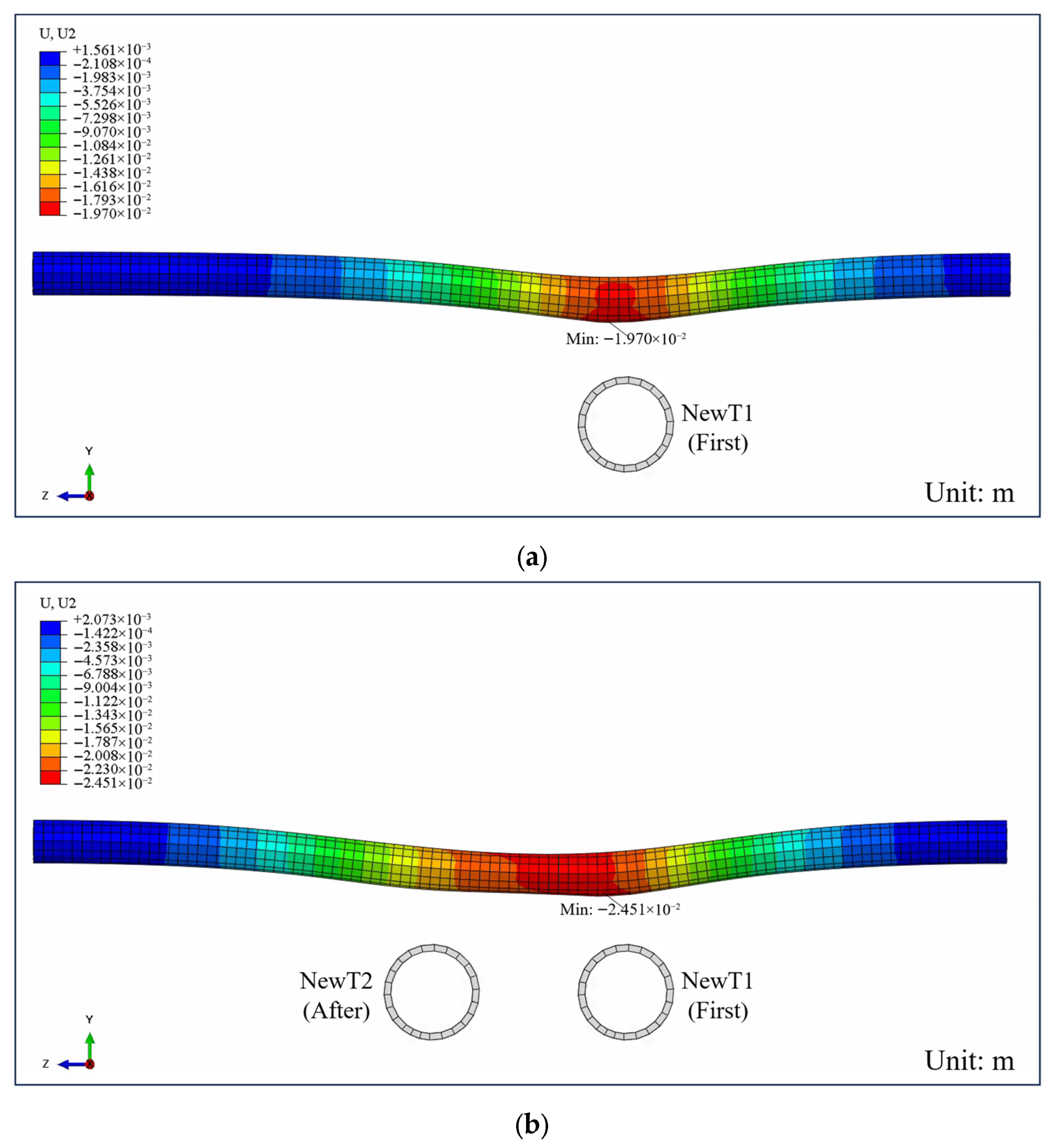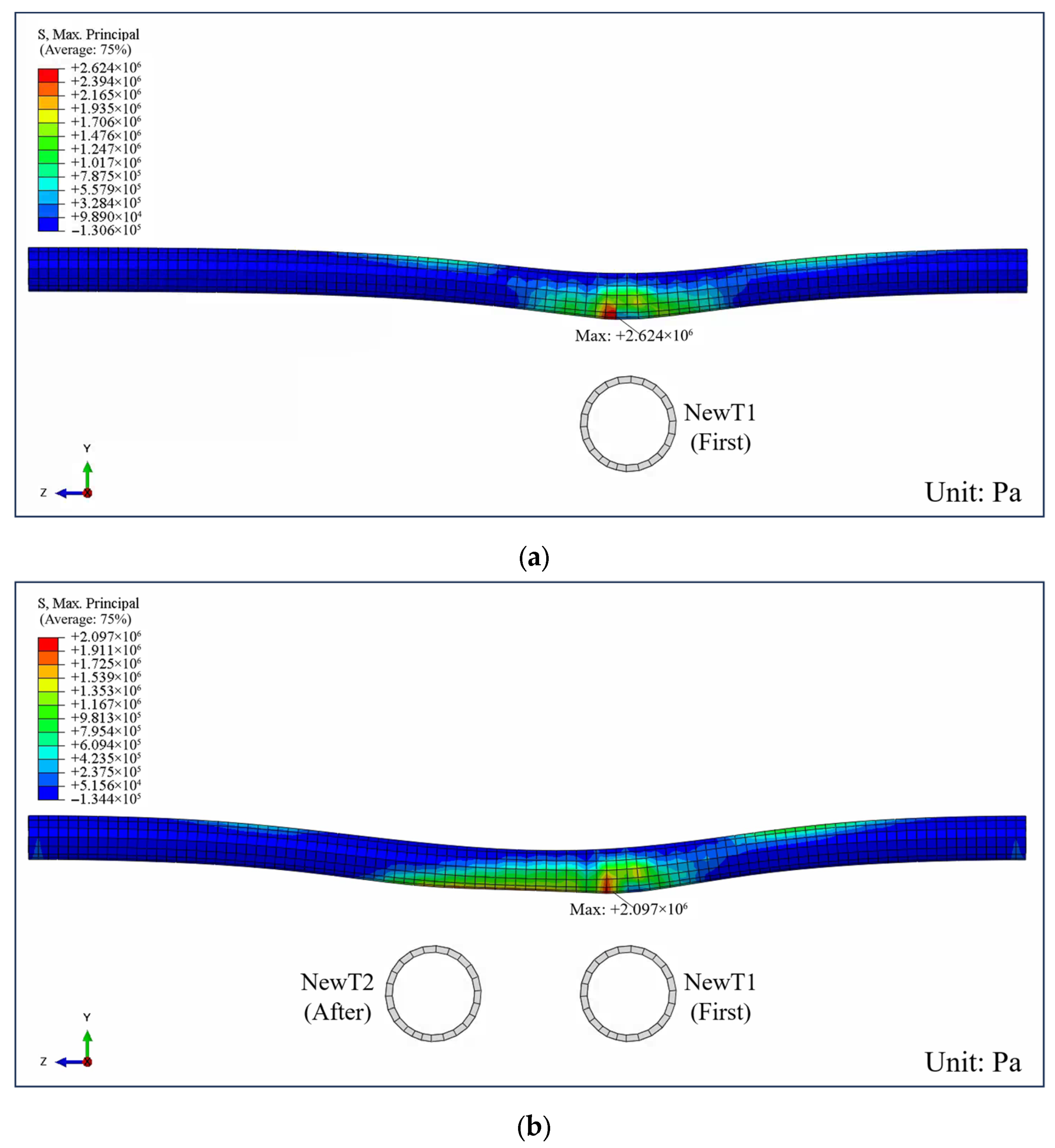 | T4 | ![]() | The stress decreases slightly, but the distribution pattern remains centered above the NewT1 axis. |