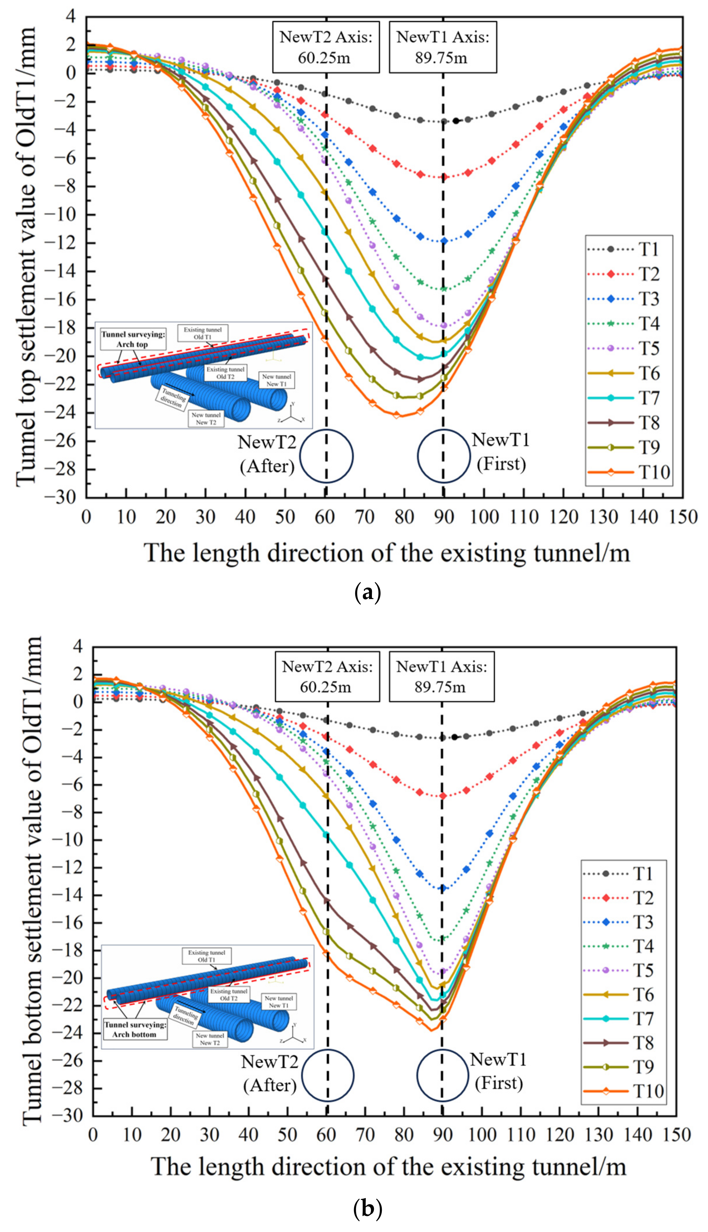 - When the single-line excavation was completed, the maximum settlement of the existing tunnel was −19.70 mm and the settlement trough exhibited a V shape. After the double-line completion, the maximum settlement increased to −24.51 mm, and the settlement trough evolved into a W shape, with the influence range expanding from about 40 m during the single-line stage to about 60 m. The position of the peak settlement shifted from the axis of the first tunnel toward the central axis of the double-line tunnels.