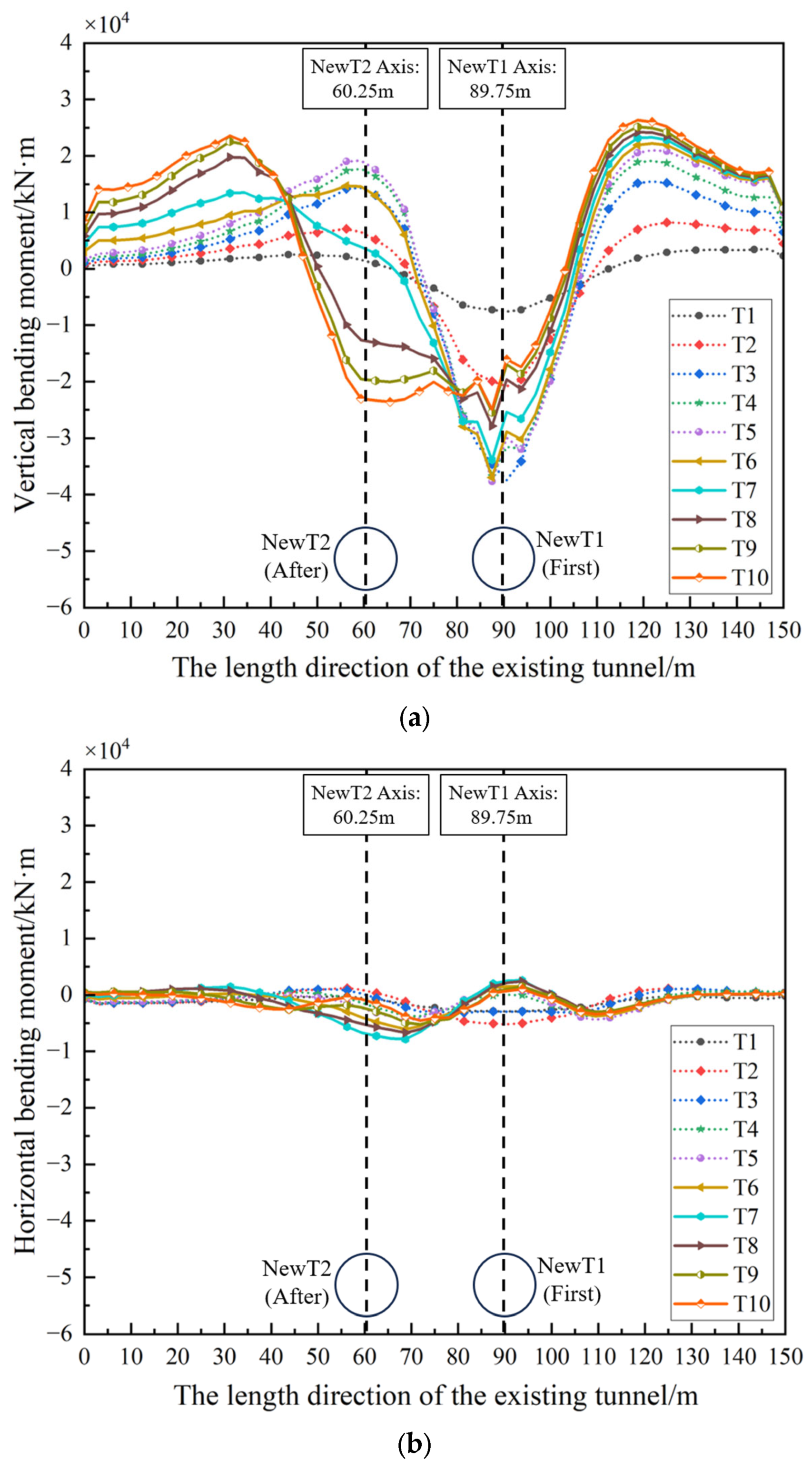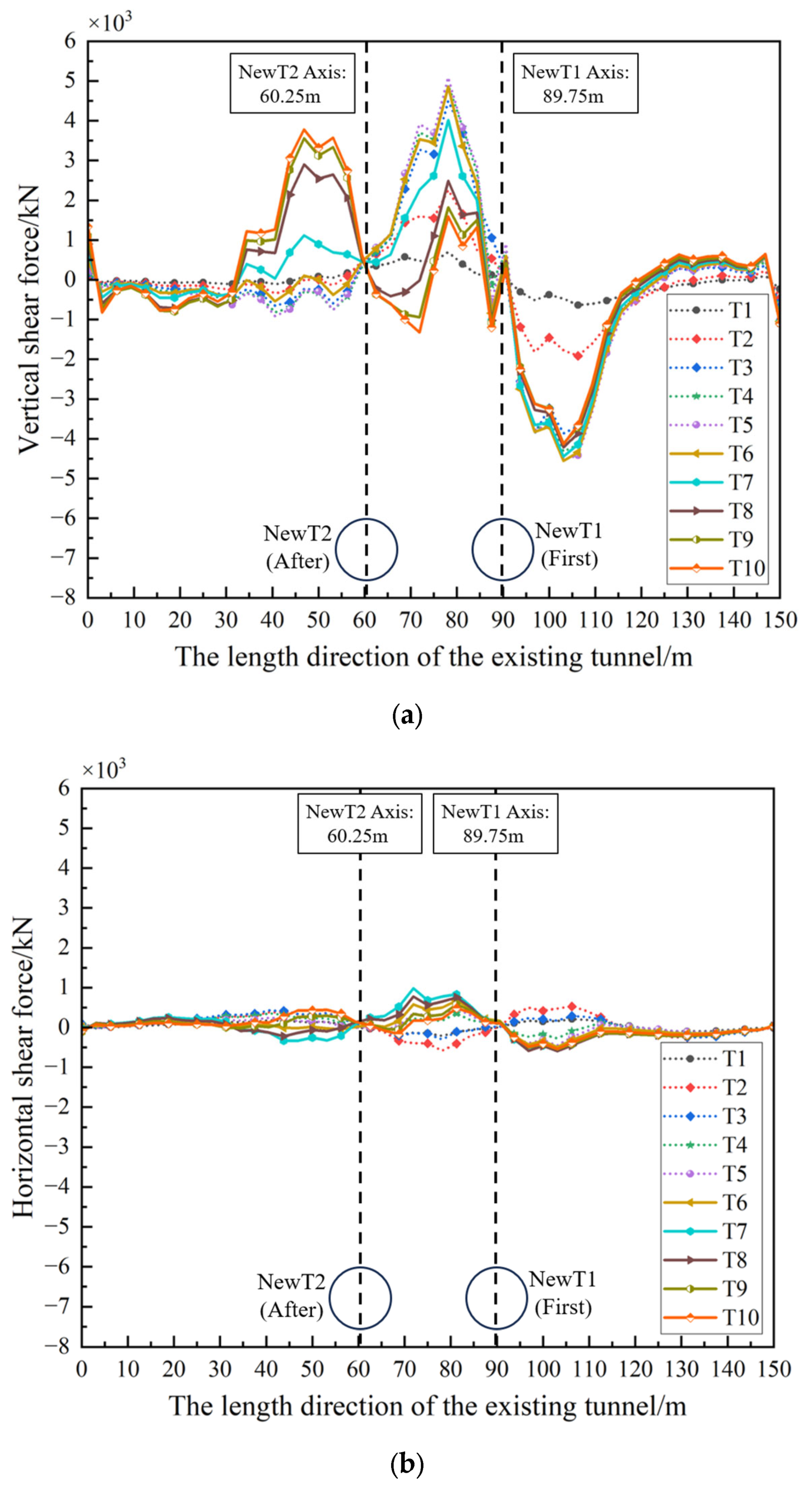 - The vertical bending moment reached its maximum after the completion of single-line excavation, with the peak located above the axis of NewT1. Following the double-line completion, its distribution evolved from a single-peak pattern into a broad, gentle, double-peak pattern, and the influence range expanded significantly. The maximum horizontal bending moment was only 1/8 of the vertical bending moment, confirming that vertical bending is the dominant loading mode. The shear force analysis indicated that the construction of the after tunnel generally increased the vertical shear force values, widened the affected zone, and formed a high-shear risk area between approximately 78 m and 103 m on both sides of the axis of the first tunnel.
