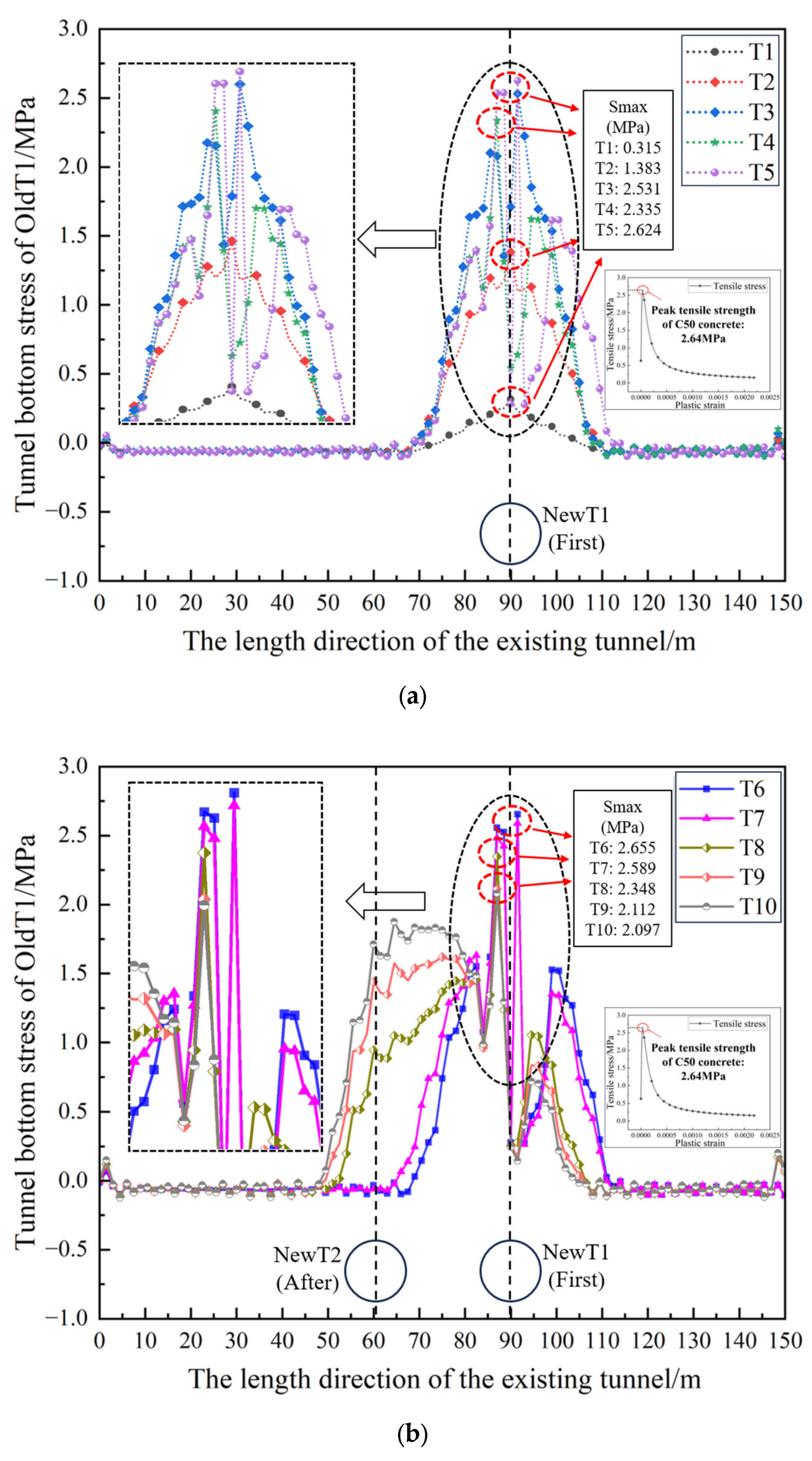| T6 | ![]() | After tunnel NewT2 advances six rings, stress reaches the process peak of 2.655 MPa, exceeding the tensile strength of C50 concrete. |