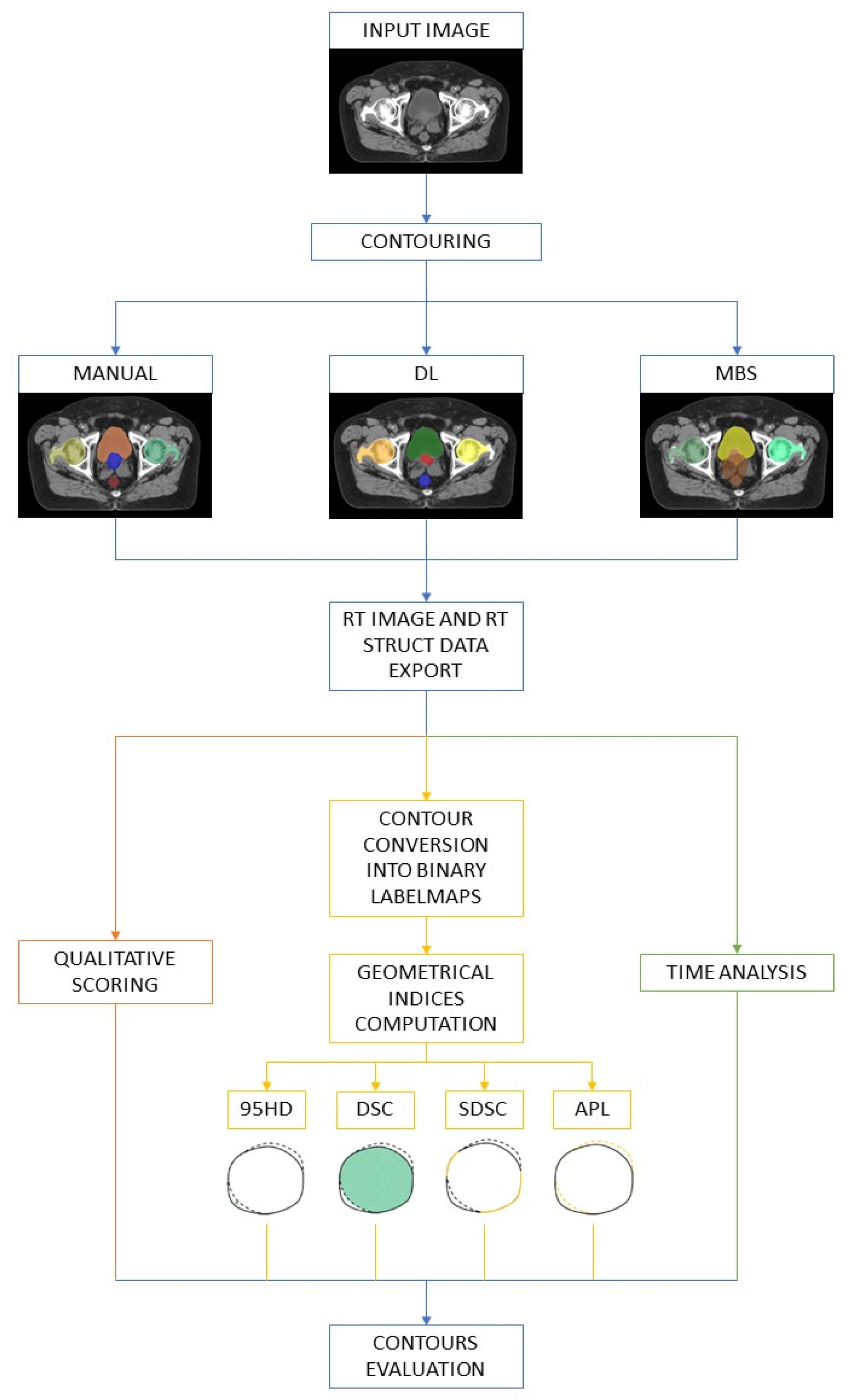The autocontouring performances of the MBS and DL segmentation algorithms for pelvic structures were evaluated on 28 anonymized male pelvis CT scans, considering the manual contours as the GT. Some of the most used geometric indices, i.e., DSC and HD, as well as novel geometric performance metrics, i.e., SDSC, APL, and RAPL, have been used for the evaluation, along with non-geometrical indices. A qualitative score was assigned by two expert ROs to the automatically generated segments to assess the quality of the contours, based on clinical applicability. Then, a speed comparison between a completely manual procedure and an automatic procedure, followed by manual editing of the contours, was carried out to assess if time saving can be achieved by using the algorithms in clinical practice.