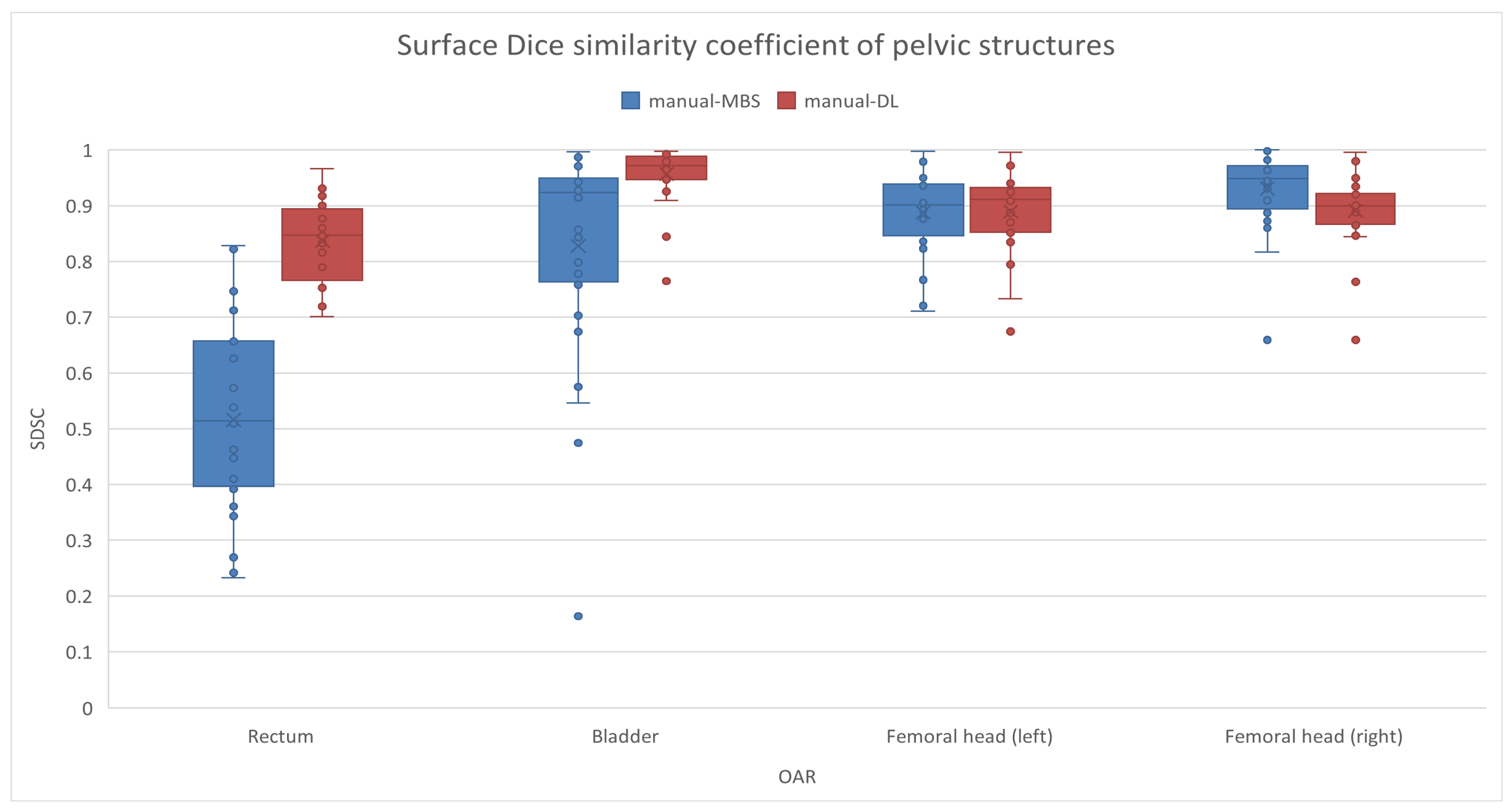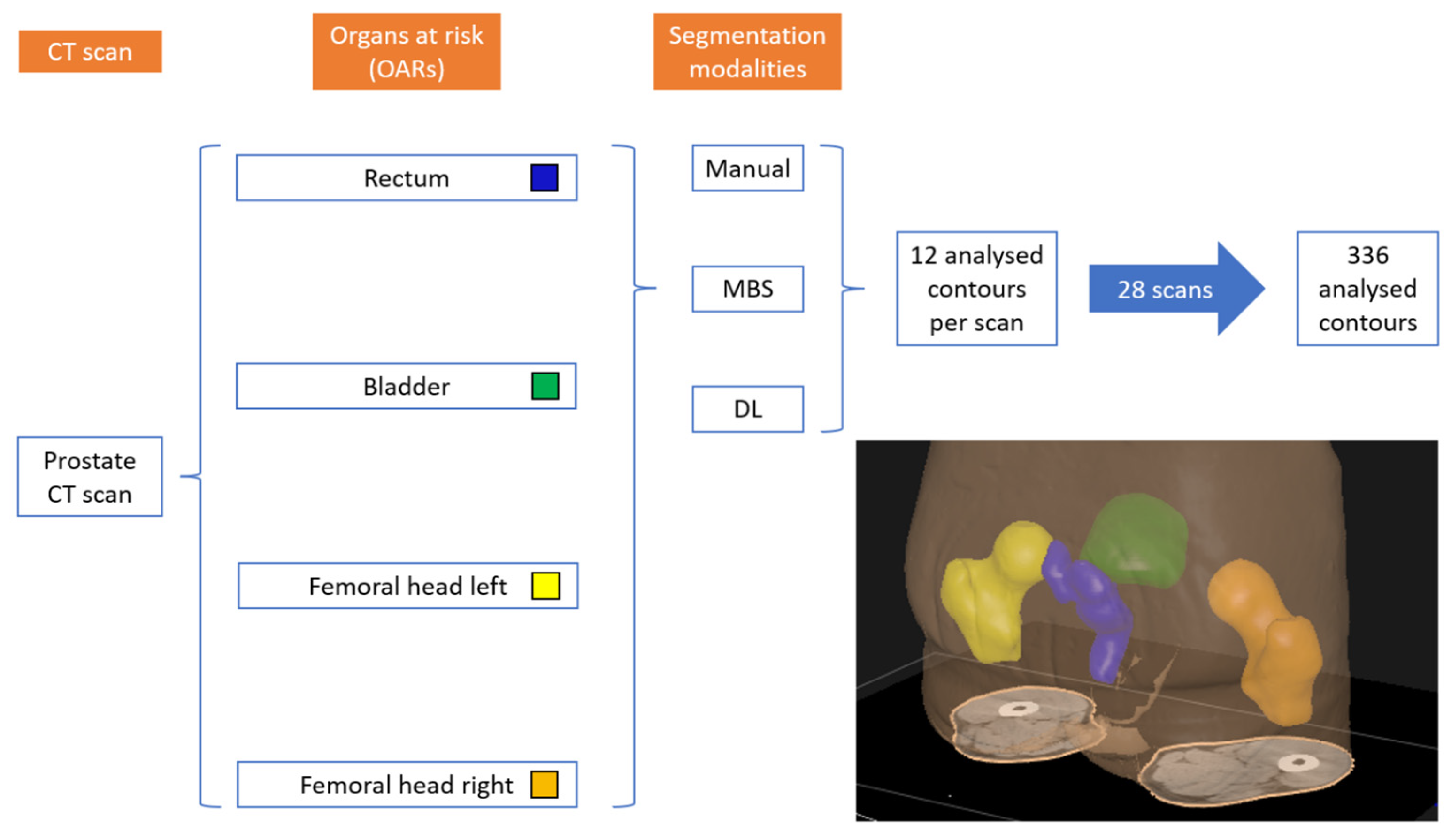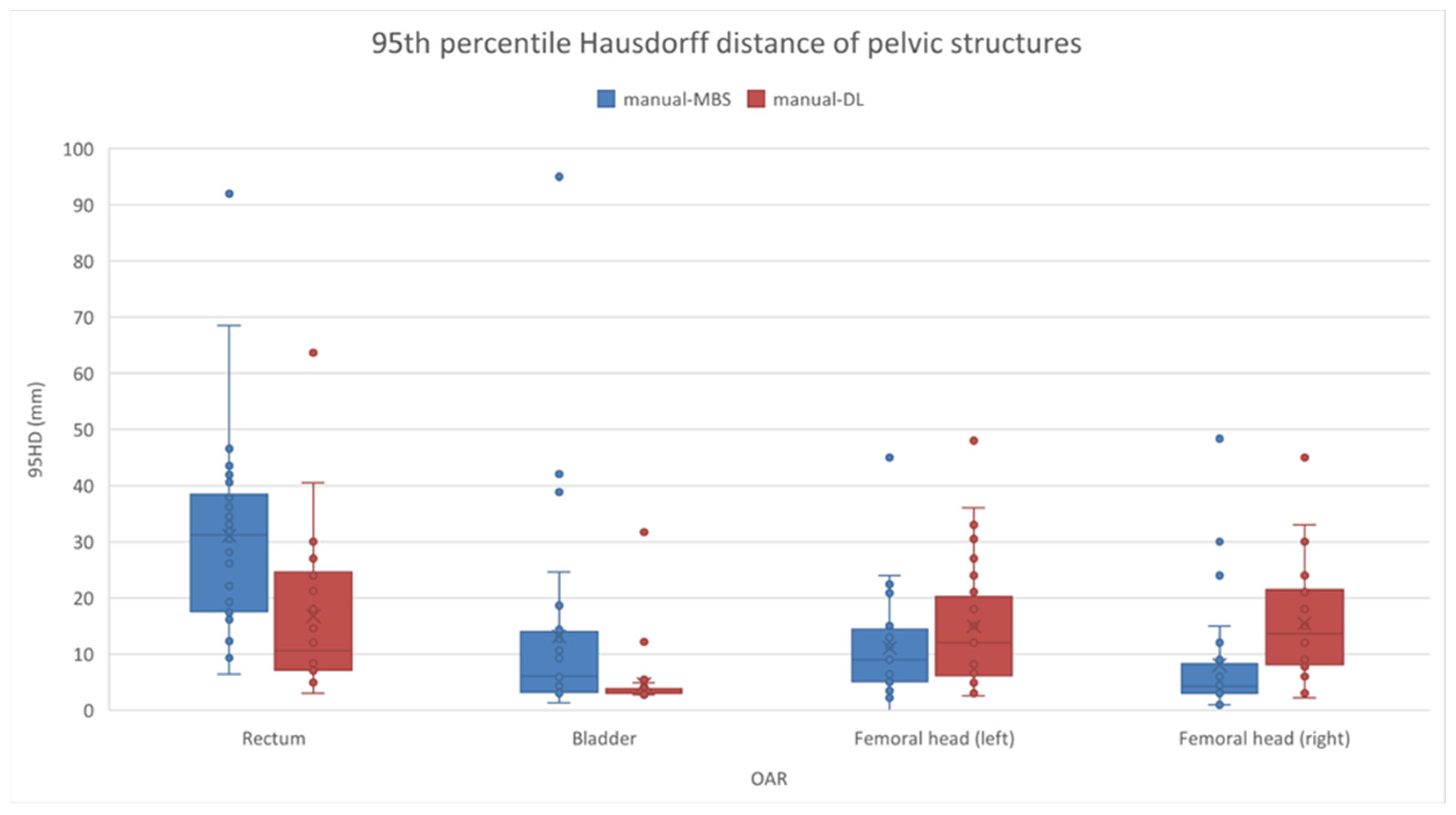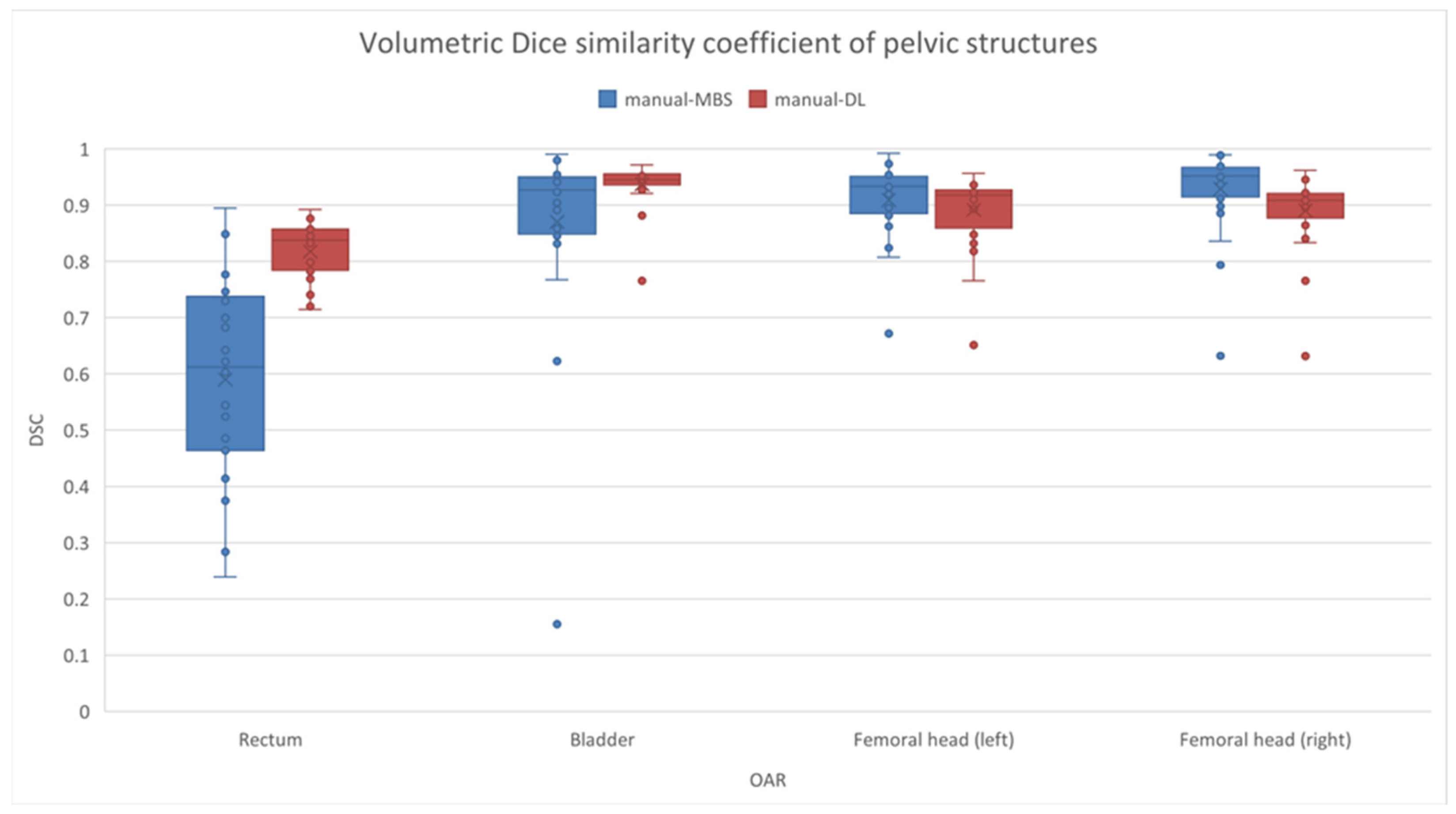 For every CT image, four OARs were manually contoured, i.e., the rectum, bladder, and left and right femoral heads. The OARs were also contoured using both the MBS and the DL segmentation algorithms. A total of 336 contours were obtained and analyzed (