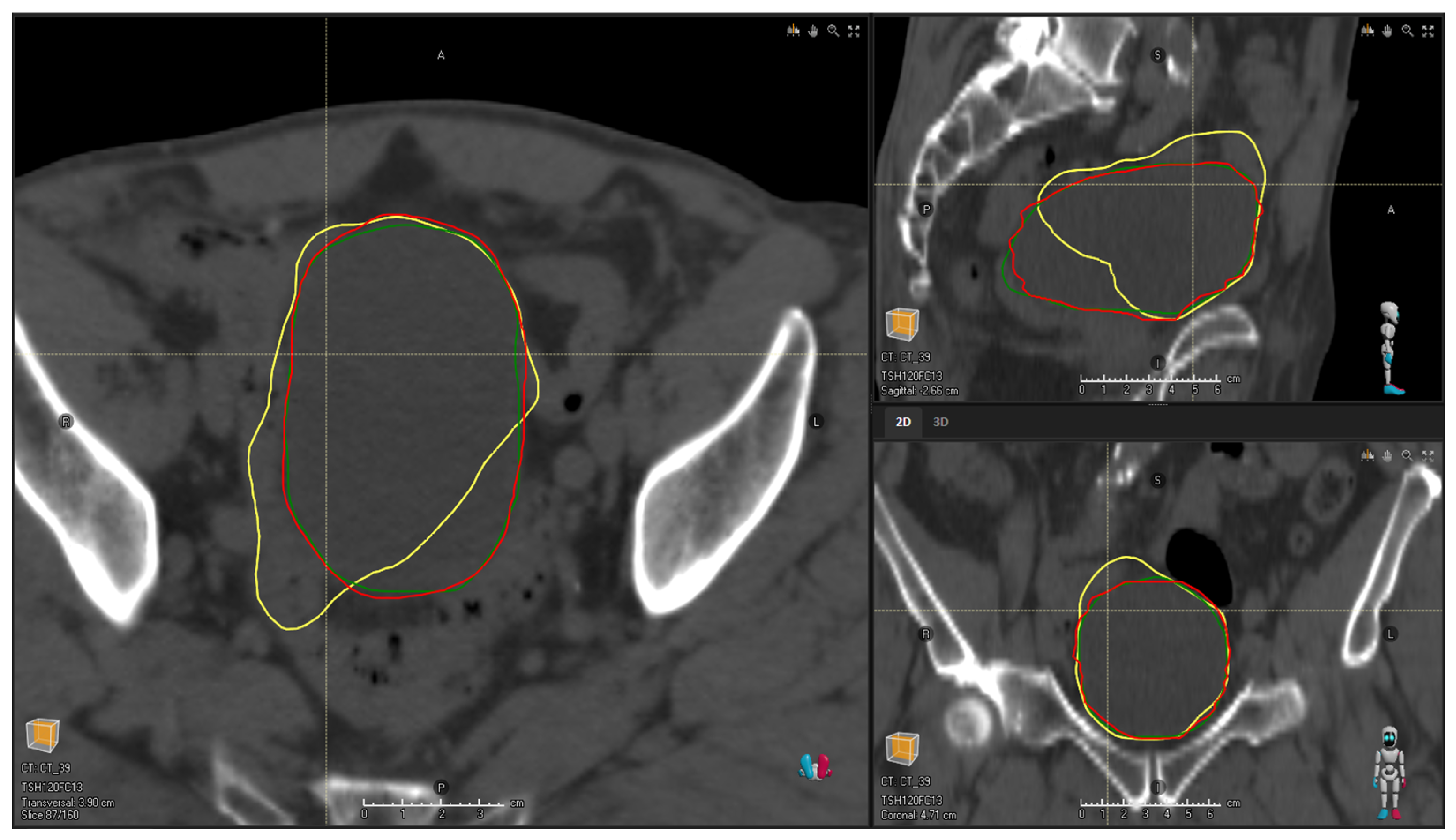 The study used 28 anonymized planning CT scans from patients enrolled in a clinical trial evaluating a hypofractionated radiotherapy regimen for prostate cancer. The present analysis did not assess the clinical outcomes of the original trial. All patients provided written informed consent.