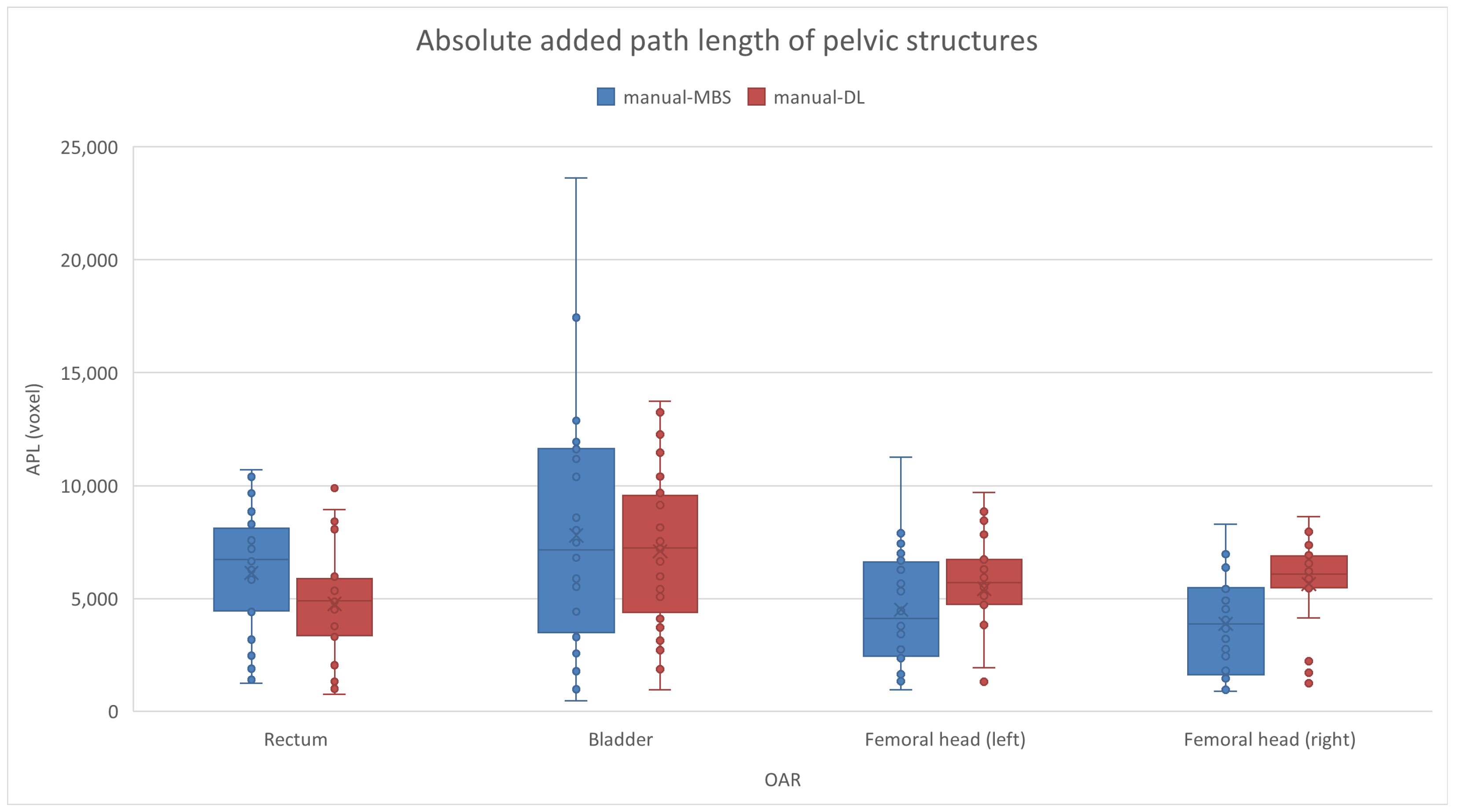 Boxplot of APL for the five OARs contoured using the MBS (blue boxes) and DL (red boxes) algorithms.