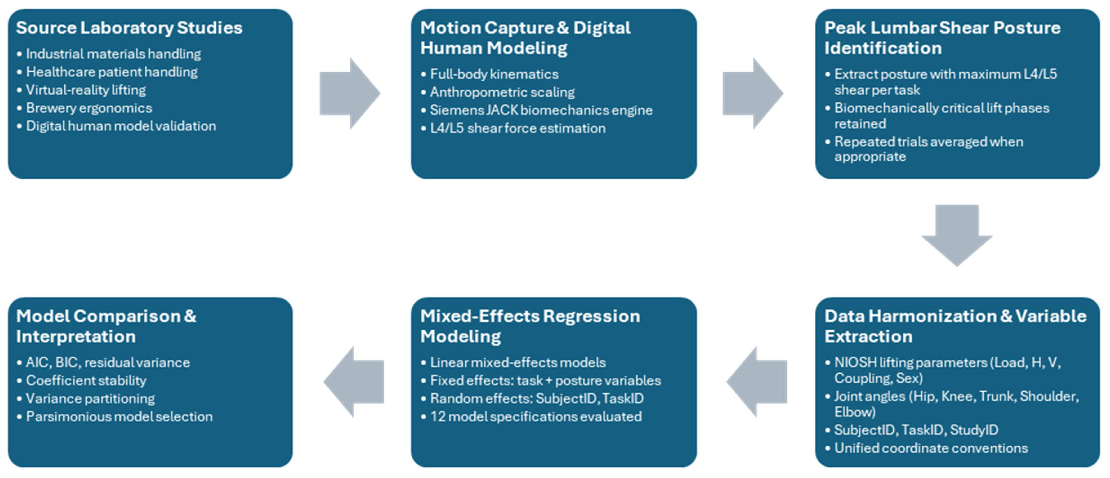 The present work establishes a statistical modeling approach that relates commonly used NIOSH lifting descriptors to lumbar shear forces estimated through validated biomechanical simulations. To build this framework, datasets were compiled from multiple laboratory investigations that reported spinal loading outcomes derived from motion capture recordings, digital human modeling platforms, and inverse-dynamics analysis. Shear-force estimates were treated as reference outputs from validated digital human modeling rather than as independently derived biomechanical quantities. Only the postures corresponding to the highest shear demands within each lifting trial were retained, as these frames best represent the mechanical conditions associated with elevated injury risk. By merging these observations into a harmonized dataset, we generated a comprehensive collection of lifting scenarios that vary in load magnitude, hand location and trunk posture. This pooled dataset served as the basis for constructing mixed-effects regression models designed to quantify how NIOSH task parameters predict L4/L5 shear forces across subjects and study protocols. An overview of the study workflow, including data sources, posture extraction, and modeling steps, is provided in