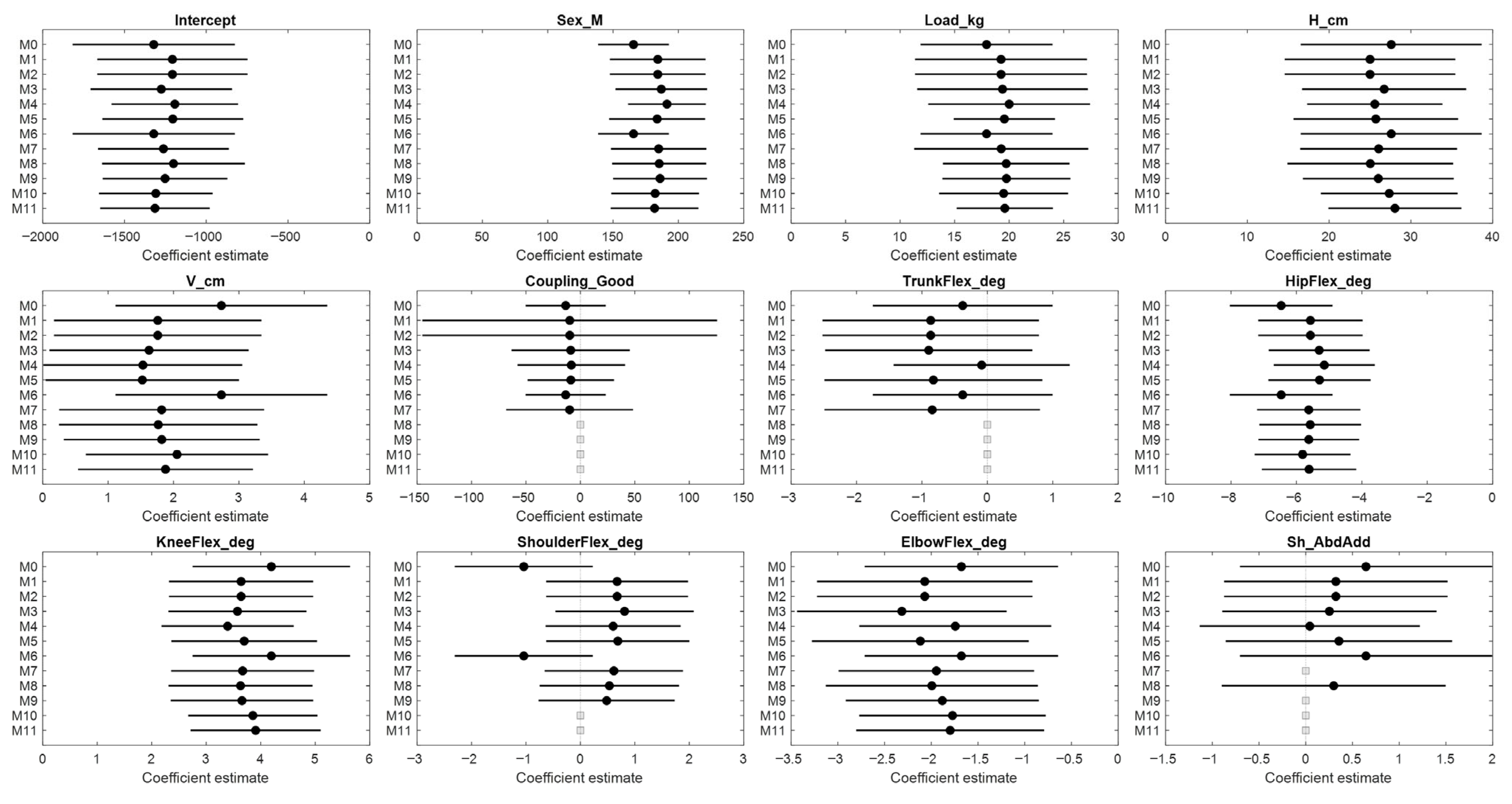 Figure 5 presents the estimated fixed-effect coefficients for all twelve mixed-effects models, expressed as Estimate ± Standard Error. The figure provides an integrated view of how each predictor contributes to L4/L5 shear force under different model specifications and highlights the degree to which each parameter remains stable or varies across the full model set. Detailed coefficient values are reported in