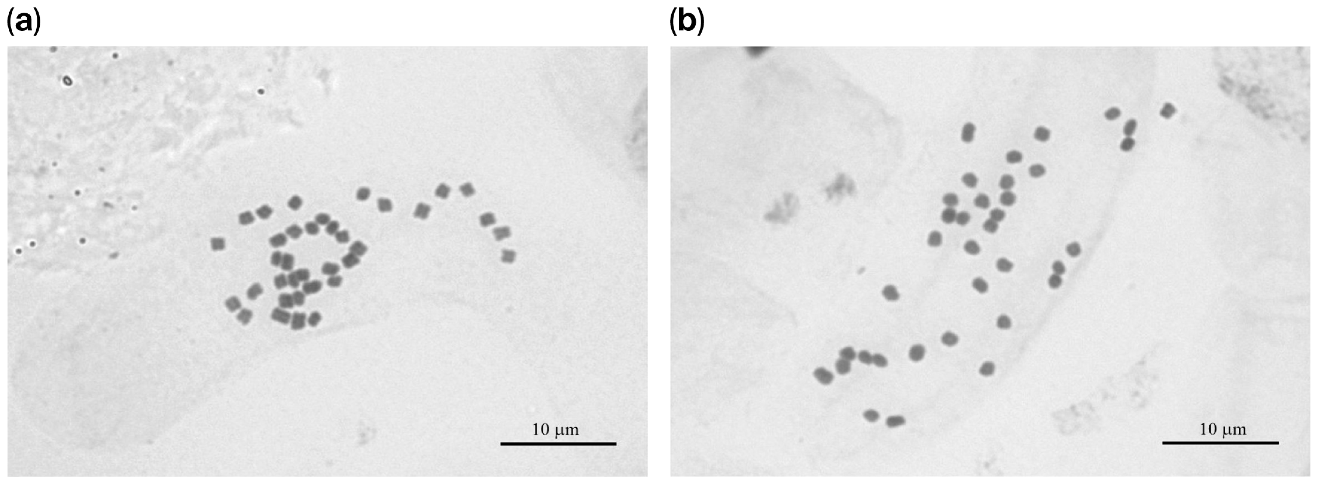 - Musiał, K.; Pagitz, K.; Gudžinskas, Z.; Łazarski, G.; Pliszko, A. Chromosome numbers in hybrids between invasive and native Solidago (Asteraceae) species in Europe. Phytotaxa 2020, 471, 267–275. [Google Scholar] [CrossRef]