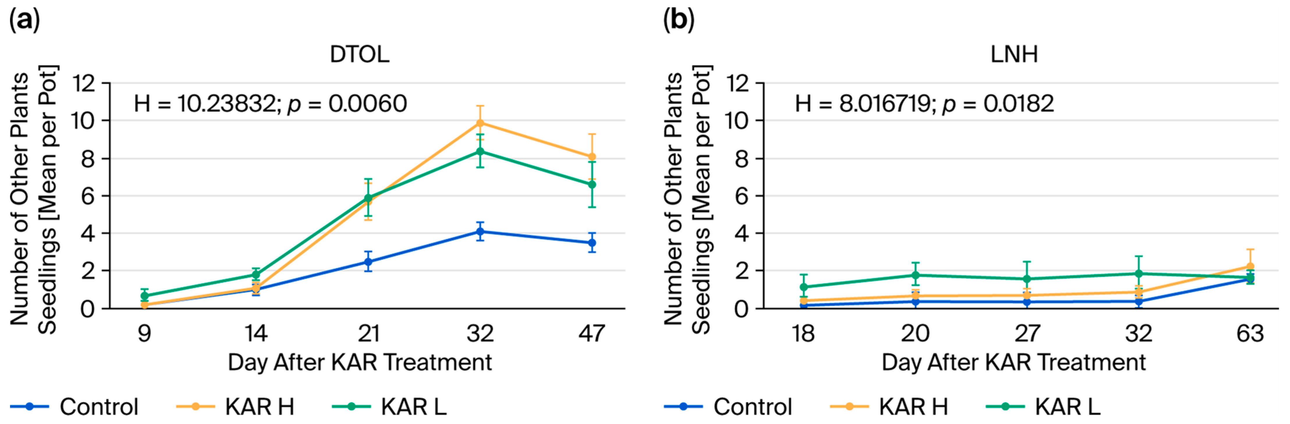 3.4. The Impact of KAR on the Goldenrod Sprouting and Vegetative Development of Other Plants