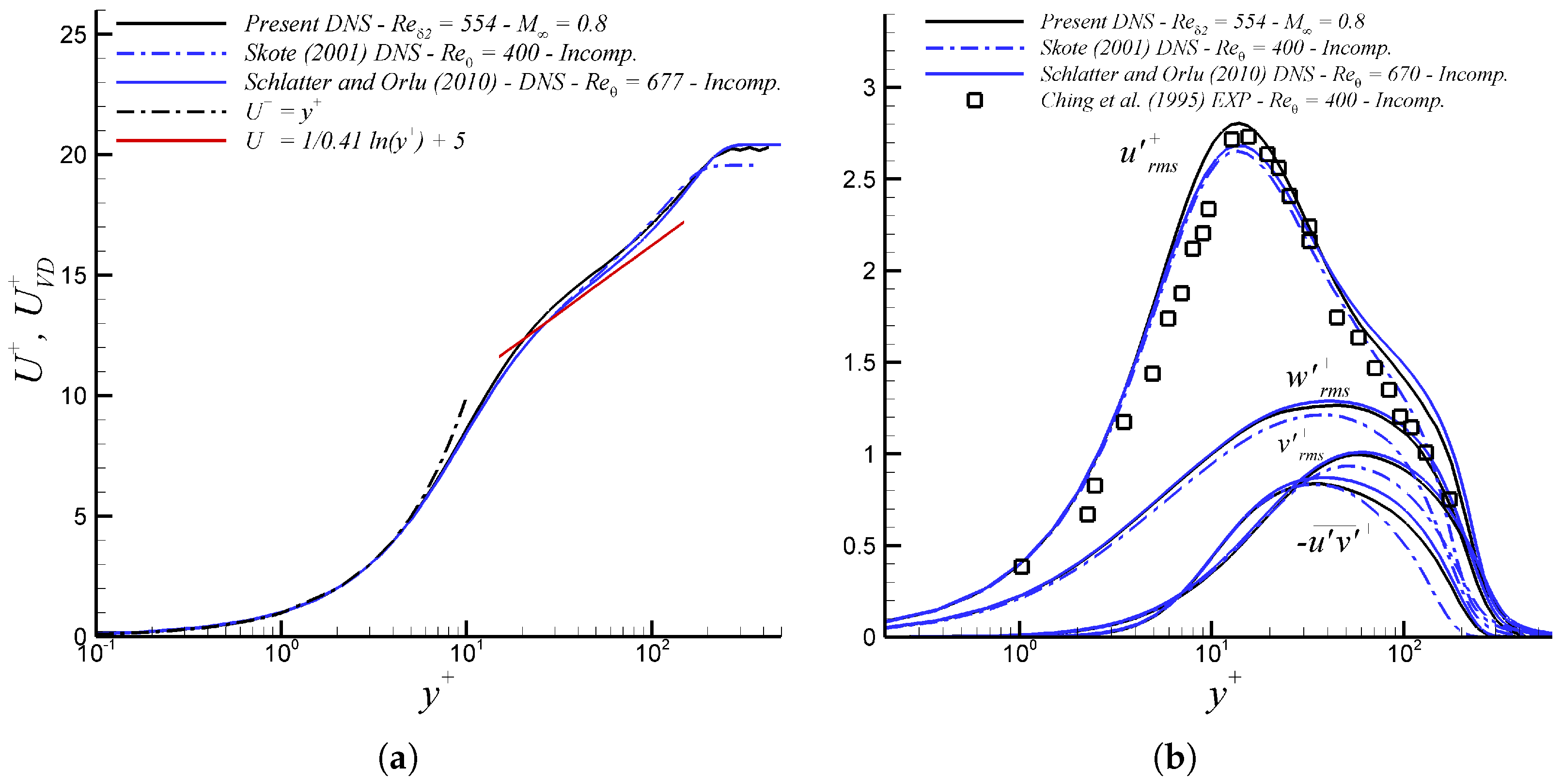 Figure 2a depicts the time-averaged streamwise velocity profile expressed in inner (wall) units for a canonical zero-pressure-gradient (ZPG) subsonic turbulent boundary layer at a freestream Mach number of