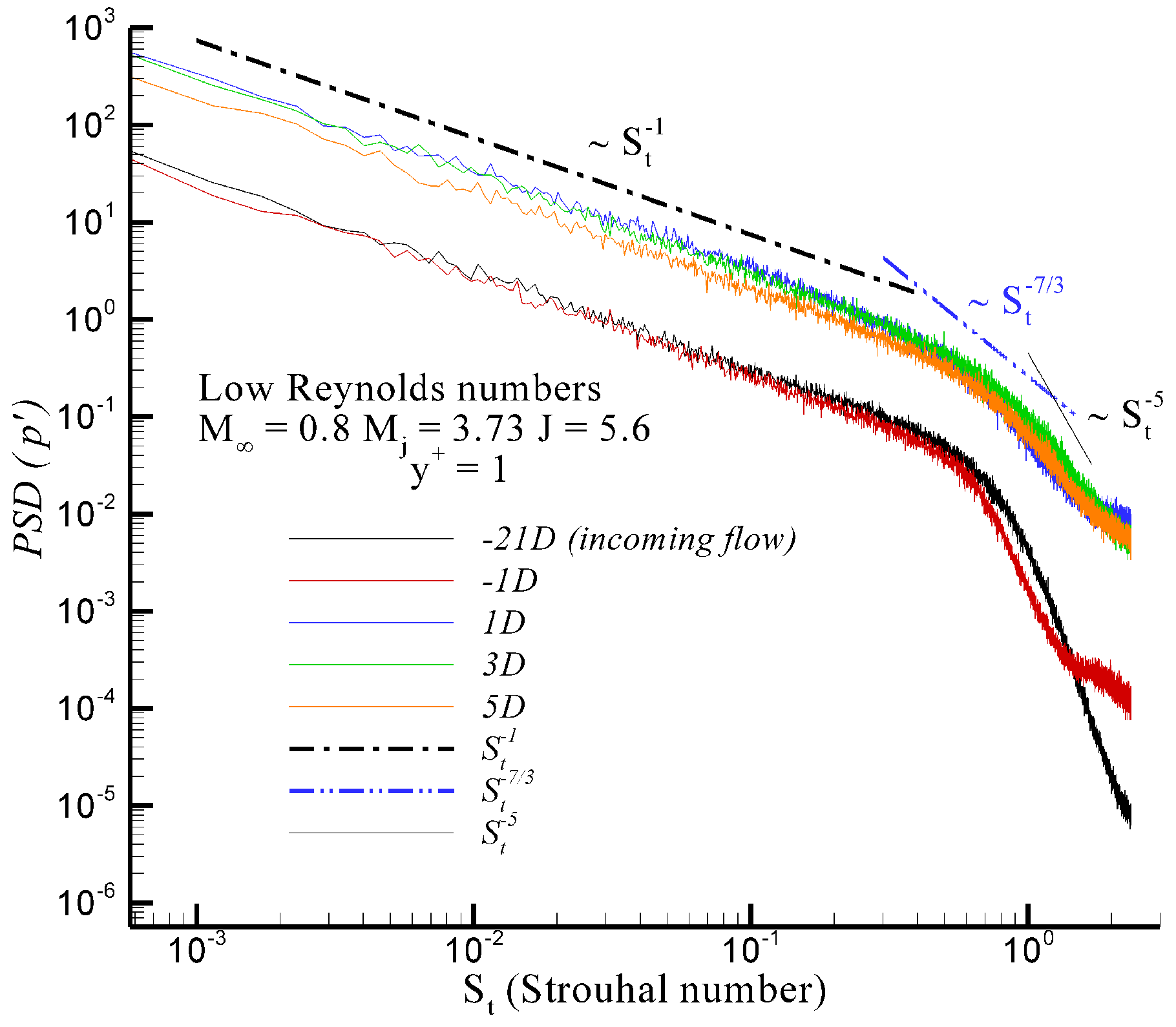 D represents the jet diameter. Reference spectral slopes corresponding to canonical pressure-fluctuation scaling laws are superimposed, including the low-frequency, large-scale regime (