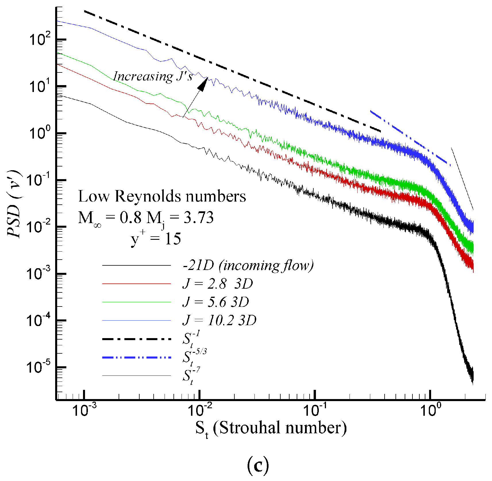 attain large values. The frequency content is nondimensionalized using the Strouhal number, defined as