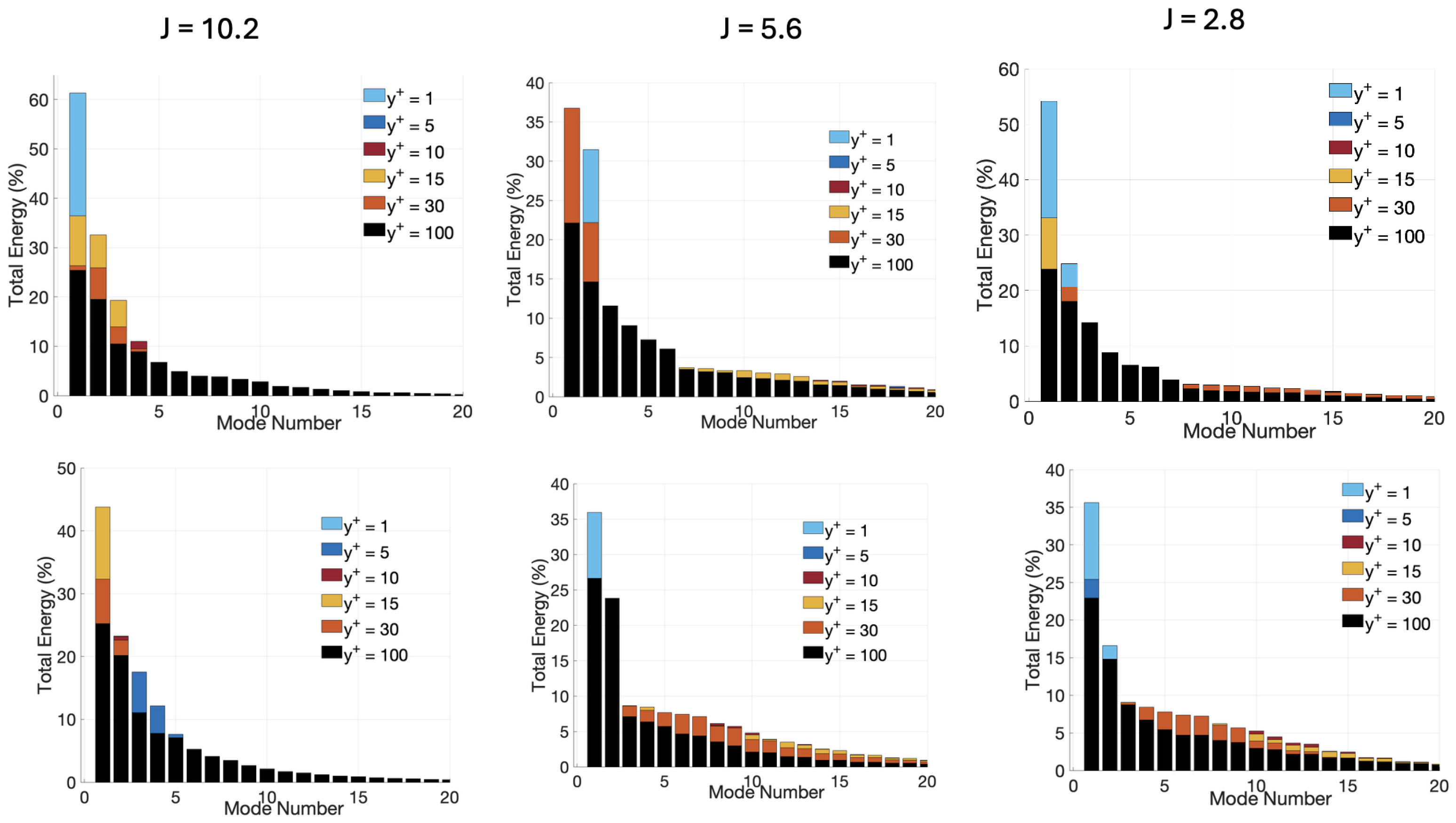 For a low momentum-flux ratio (J = 2.8), the jet remains largely attached to the wall and is rapidly bent over by the crossflow. In this case, the dominant vortical structures are neither fully detached into the outer flow nor confined strictly to the viscous sublayer. Instead, they are concentrated by the end of the linear viscous layer around , where the balance between mean shear production and viscous dissipation favors the persistence of coherent structures. Very close to the wall (), viscous damping suppresses large-scale coherence, while farther from the wall (), the weakened jet lacks sufficient momentum to sustain energetic large-scale vortices. Overall, the shift in the wall-normal location of the most energetic first POD mode reflects a progressive downward migration of dominant vortical dynamics with decreasing momentum-flux ratio. High-J flows are controlled by outer-layer jet-driven vortices, moderate-J flows by near-wall coherent structures, and low-J flows by buffer-layer vortices. This behavior highlights the strong coupling between jet penetration, wall proximity, and coherent momentum transport. With increasing mode number, the energy contribution decays rapidly, and higher-order modes show comparatively larger contributions from outer wall-normal locations (). This indicates a shift from dominant, organized near-wall structures in the lowest mode to smaller-scale, less coherent wall-normal motions away from the wall.