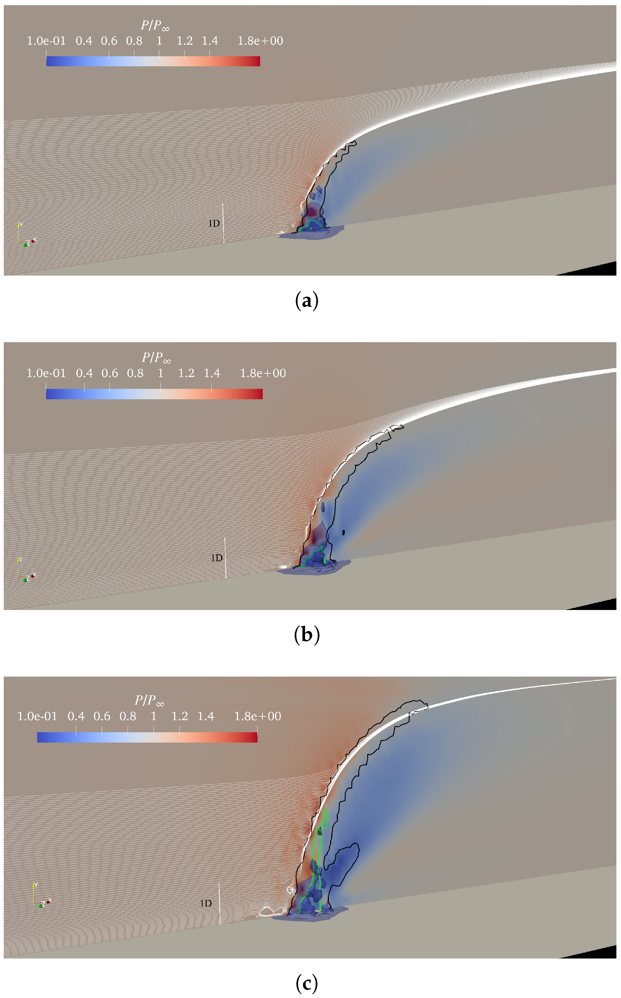 In essence, increasing J shifts the plume dynamics from a slow, wall-controlled flapping regime to a faster, jet-dominated oscillatory regime. The observed frequency shift of the arc-shaped structure therefore reflects a change in the balance between jet momentum, crossflow forcing, and wall influence. This behavior highlights the strong sensitivity of large-scale coherent dynamics to momentum-flux ratio in supersonic jet-in-crossflow configurations. The figure demonstrates a clear scale separation of coherent structures in the jet-in-crossflow system. Low-frequency SPOD modes are dominated by global jet flapping and CVP-driven motion, intermediate frequencies by shear-layer roll-up and instability dynamics, and high frequencies by small-scale turbulence. This hierarchy confirms that unsteady jet penetration and wall interaction are governed primarily by low- to intermediate-frequency coherent structures, while higher-frequency motions mainly contribute to dissipation and fine-scale mixing. These insights are critical for developing reduced-order models and flow-control strategies targeting specific dynamical mechanisms in high-speed jet–crossflow applications.