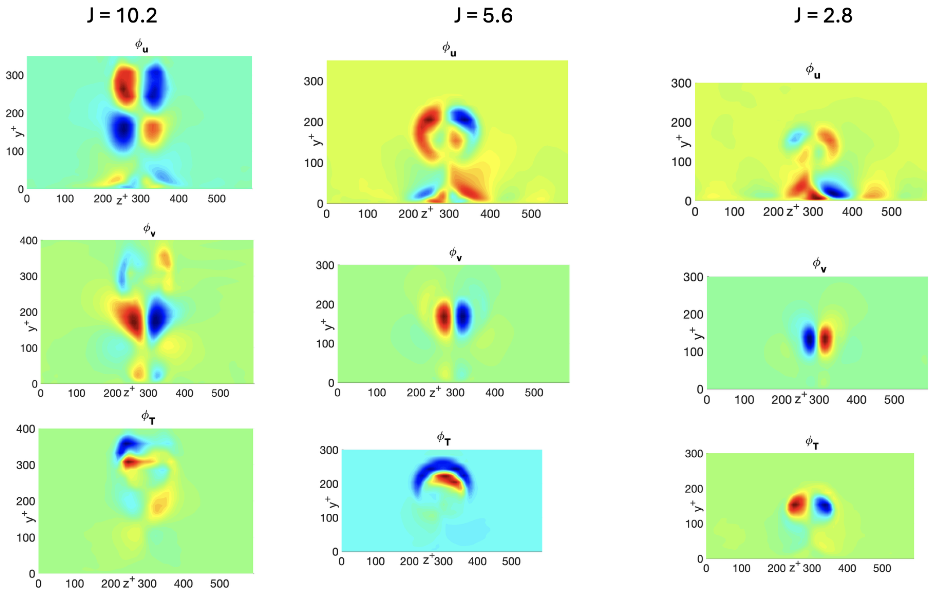 J = 2.8, indicating suppressed vortex strength and dominance of near-wall shear-driven motion. As further illustrated in