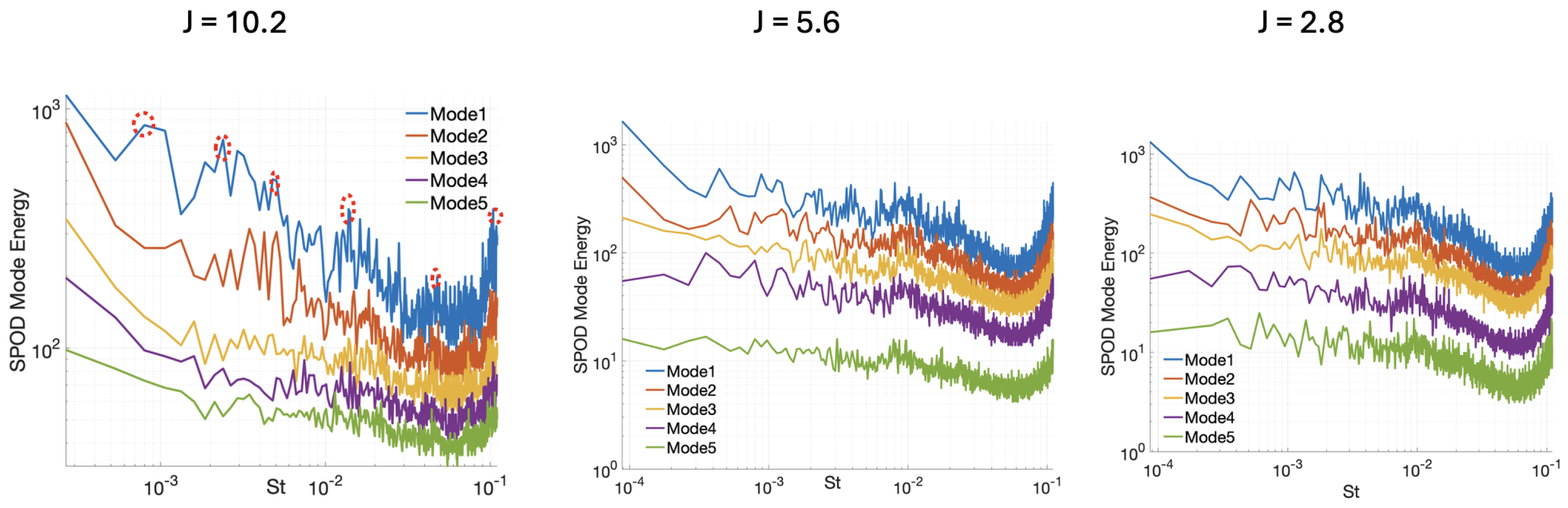 J = 10.2, the spectra display several well-defined energy peaks in Mode 1 (highlighted by red circles), indicating that the flow contains highly coherent, frequency-selective structures. These narrow-band peaks are characteristic of organized shear-layer instabilities and Kelvin–Helmholtz roll-up, which arise when the strong transverse jet penetrates deeply into the crossflow. The elevated energy in Mode 1 across the entire low- to mid-frequency range, combined with its substantial separation from Modes 2–5, confirms that a single dominant mechanism—the interaction between the jet’s upper shear layer and the CVP—governs the unsteady dynamics at this location. As the momentum ratio decreases to