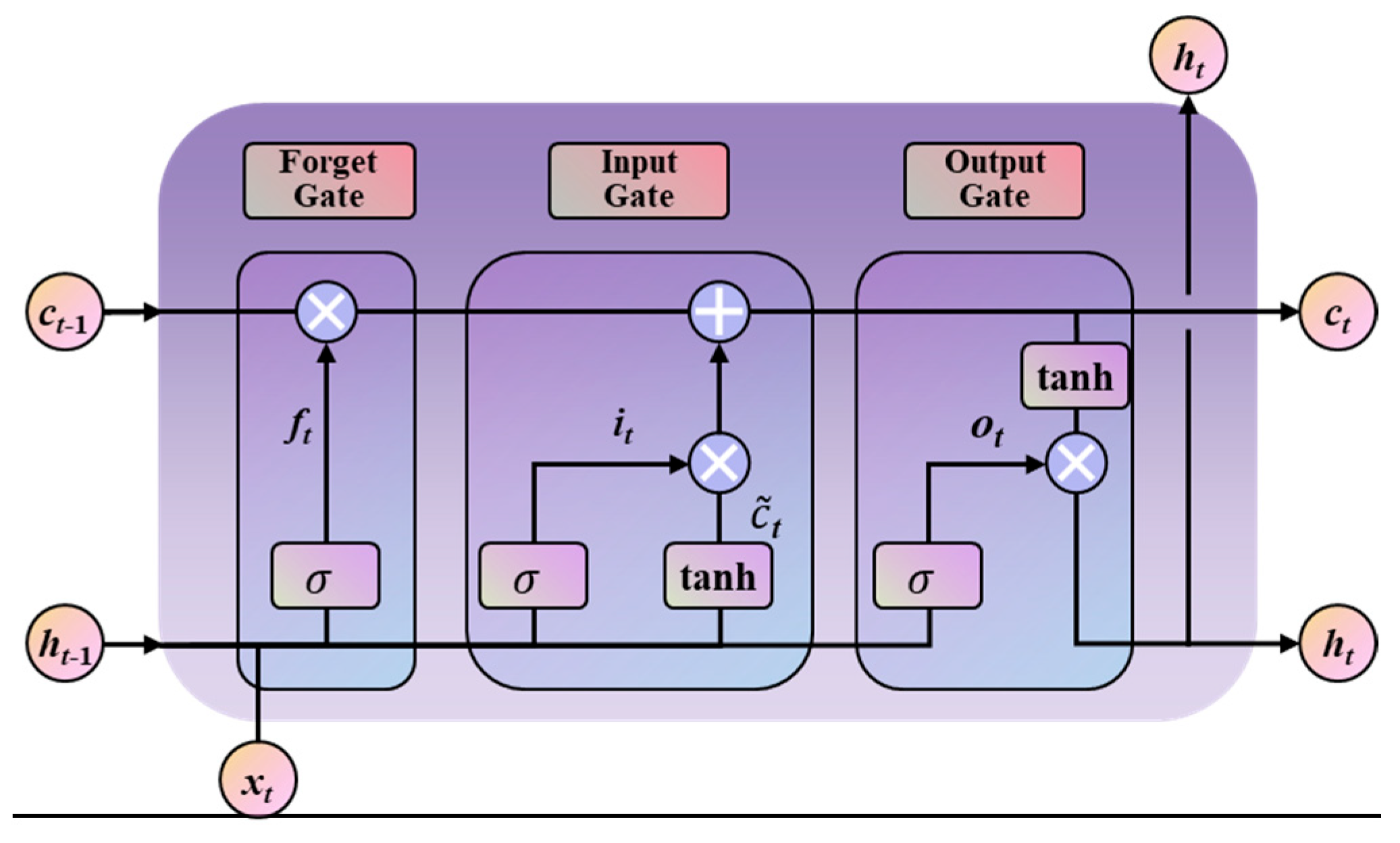 - it, ft, ot, Ct, and ht denote the outputs of the input gate, forget gate, output gate, cell state, and hidden state, respectively.
