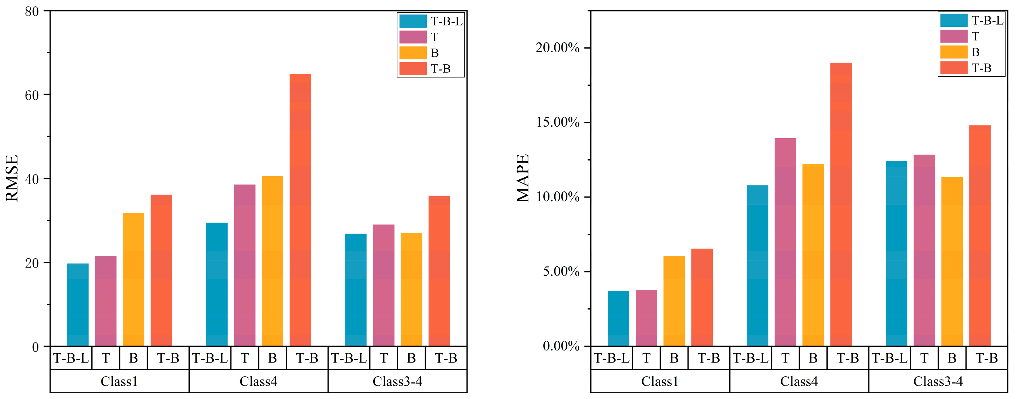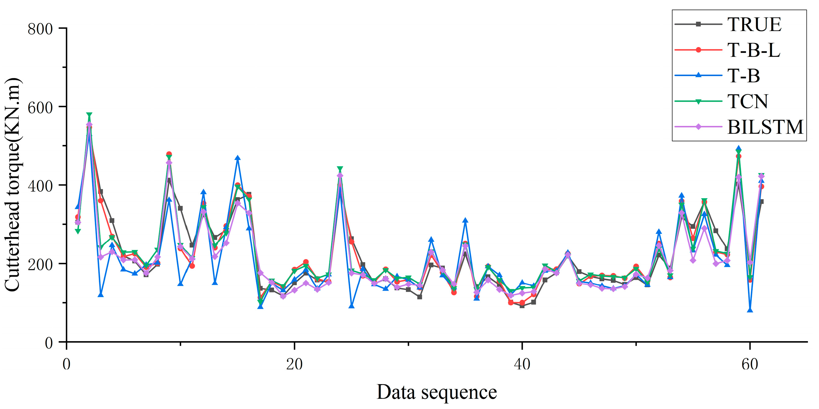 - As shown in Figure 15, the complete T-B-L model achieves the best prediction performance across all rock mass classes. In particular, under the most geologically complex conditions (Class 4), it significantly outperforms the other models, with a prediction error reduction of more than 50% compared to the T-B model without the attention mechanism. These results indicate that the rational introduction of feature selection and fusion mechanisms is critical for improving torque prediction accuracy in complex heterogeneous strata.
