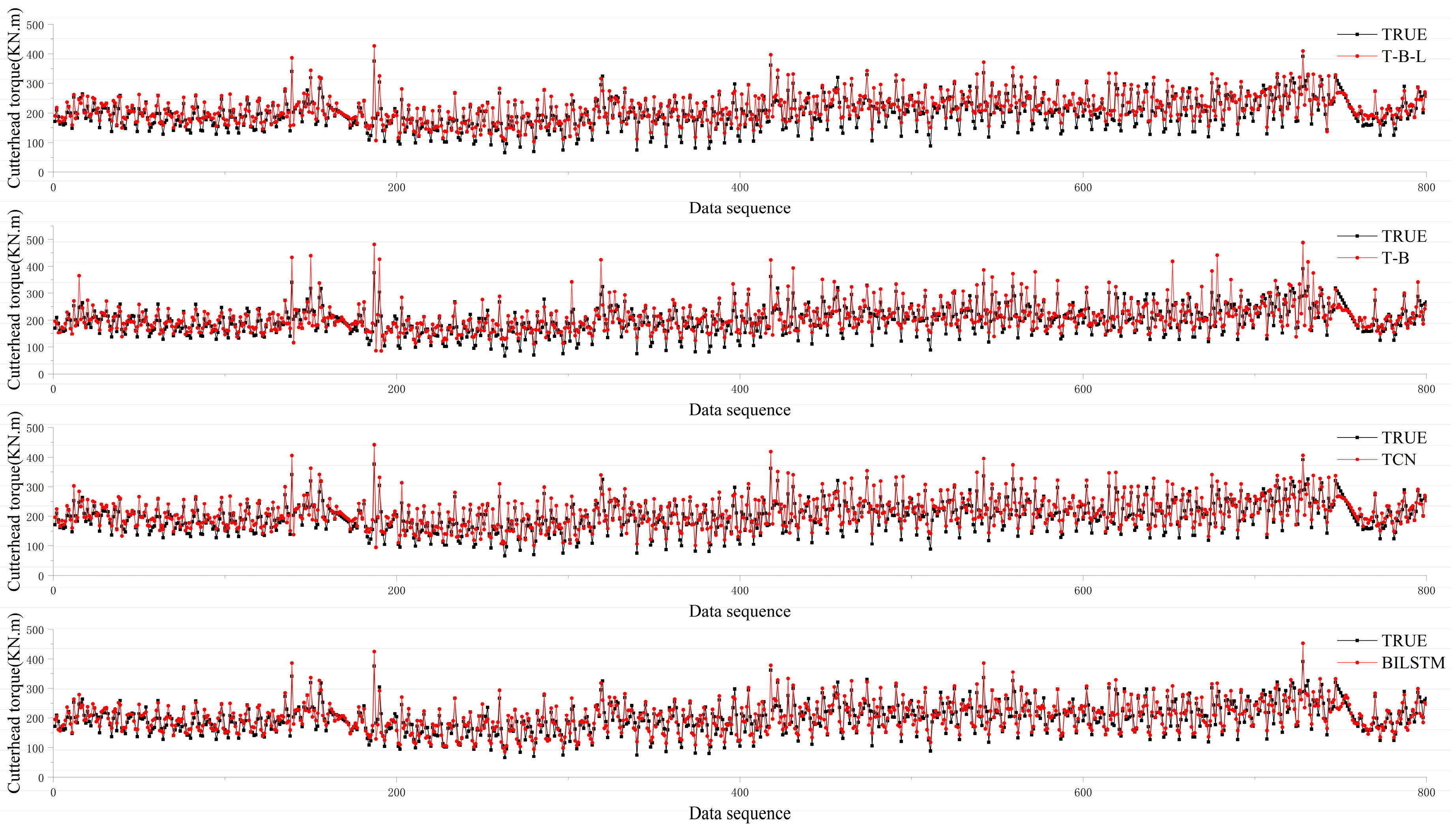 - The simple combination of TCN and BiLSTM in the T-B model fails to achieve effective synergy under varying geological conditions. In fractured rock masses, the prediction error even increases substantially, suggesting that direct feature concatenation without appropriate feature selection and weighting mechanisms may introduce redundancy or conflicts, thereby degrading overall model performance.