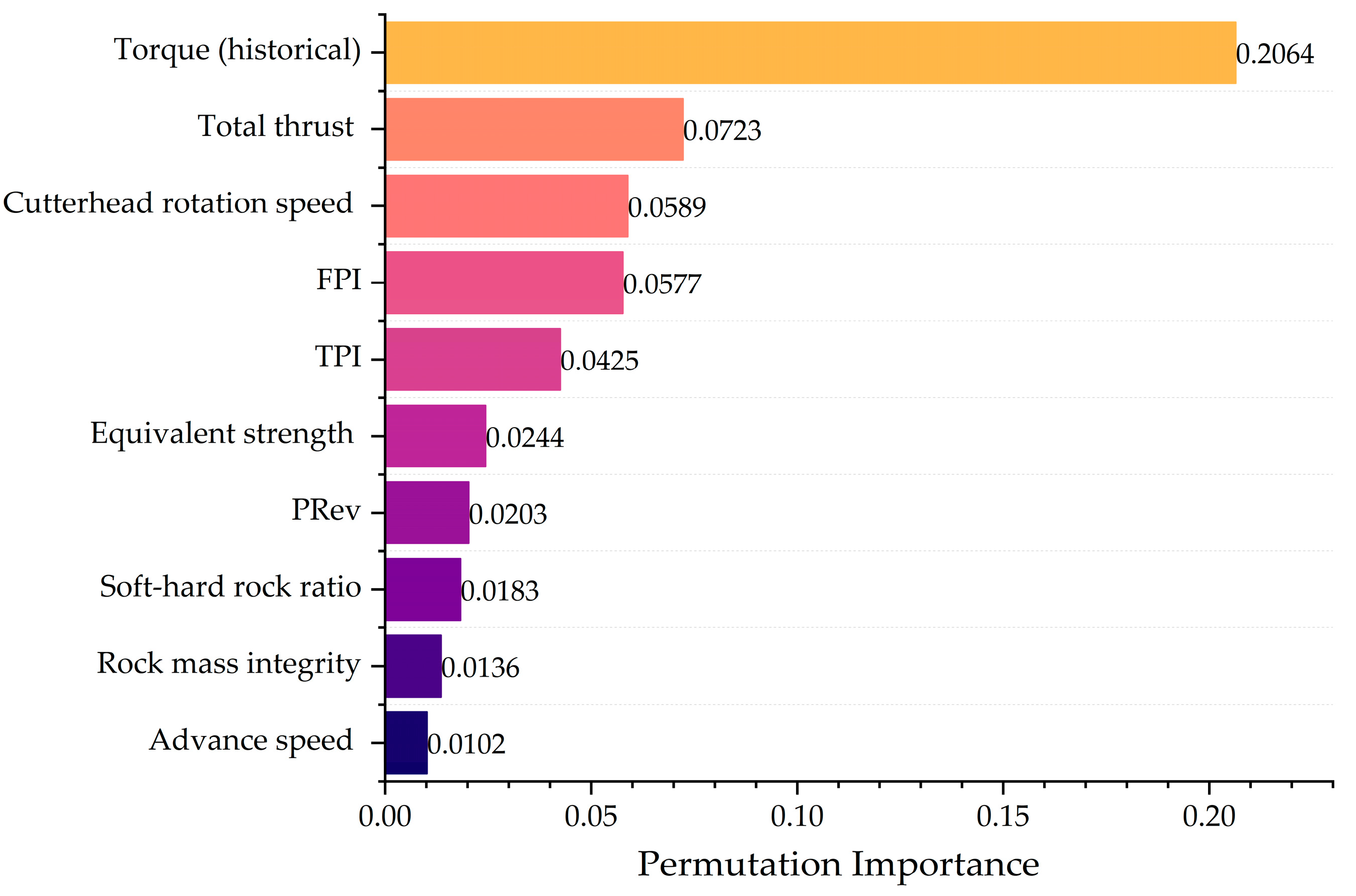 - The relatively low importance of machine performance indicators (FPI and TPI) suggests that, under the current composite strata dominated by geological–mechanical interactions, their contribution to instantaneous torque prediction is limited.