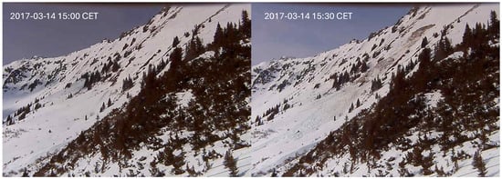 All images were screened manually, and both the occurrence and release time of glide-snow avalanches were recorded. An example of two subsequent images showing the occurrence of a glide-snow avalanche is shown in Figure 5. Two additional examples showing glide-snow avalanche releases are presented in Figure A1. While it can be difficult to spot a glide-snow avalanche on two images presented next to each other (e.g., Figure A1, upper two images), manually clicking through the image sequence on a screen makes changes between subsequent images considerably easier to detect.