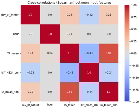 The cross-correlation matrix Figure 9 between the five meteorological and temporal input variables shows the correlations among the predictors. Mean air temperature of the preceding 48 h (TA_mean_48h) exhibits a high positive correlation with the mean hourly air temperature (TA_mean) (r = 0.81), as expected. TA_mean also shows a moderate negative correlation with the difference in snow height in the last 24 h (diff_HS24_cm) (r = −0.43). All remaining variable pairs show only weak or negligible linear correlations.