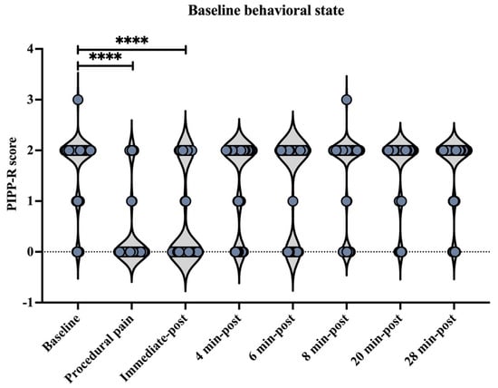 Behavioral state across time points assessed using the Premature Infant Pain Profile–Revised (PIPP-R). Violin plots illustrate the distribution of PIPP-R behavioral state scores at each time point (before, during procedural pain, immediate-post procedural pain, and 4, 6, 8, 20, and 28 min post-procedure). **** p < 0.0001 indicate statistically significant differences compared to the baseline period.