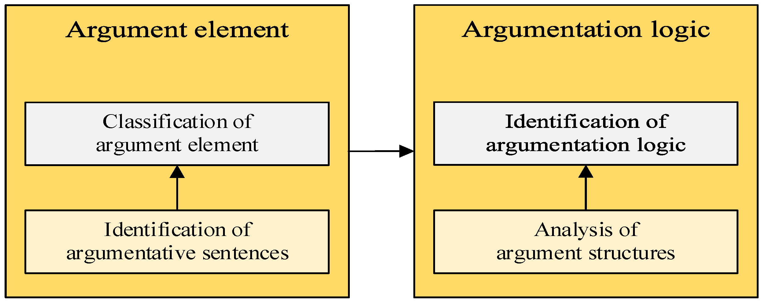 Figure 1. This covers four subfields: identification of argumentative sentences (which have a clear position and include argument elements), classification of argument elements, analysis of argument structure, and identification of argument logic. These sub-tasks together form our comprehensive understanding and analysis of argumentative essays [