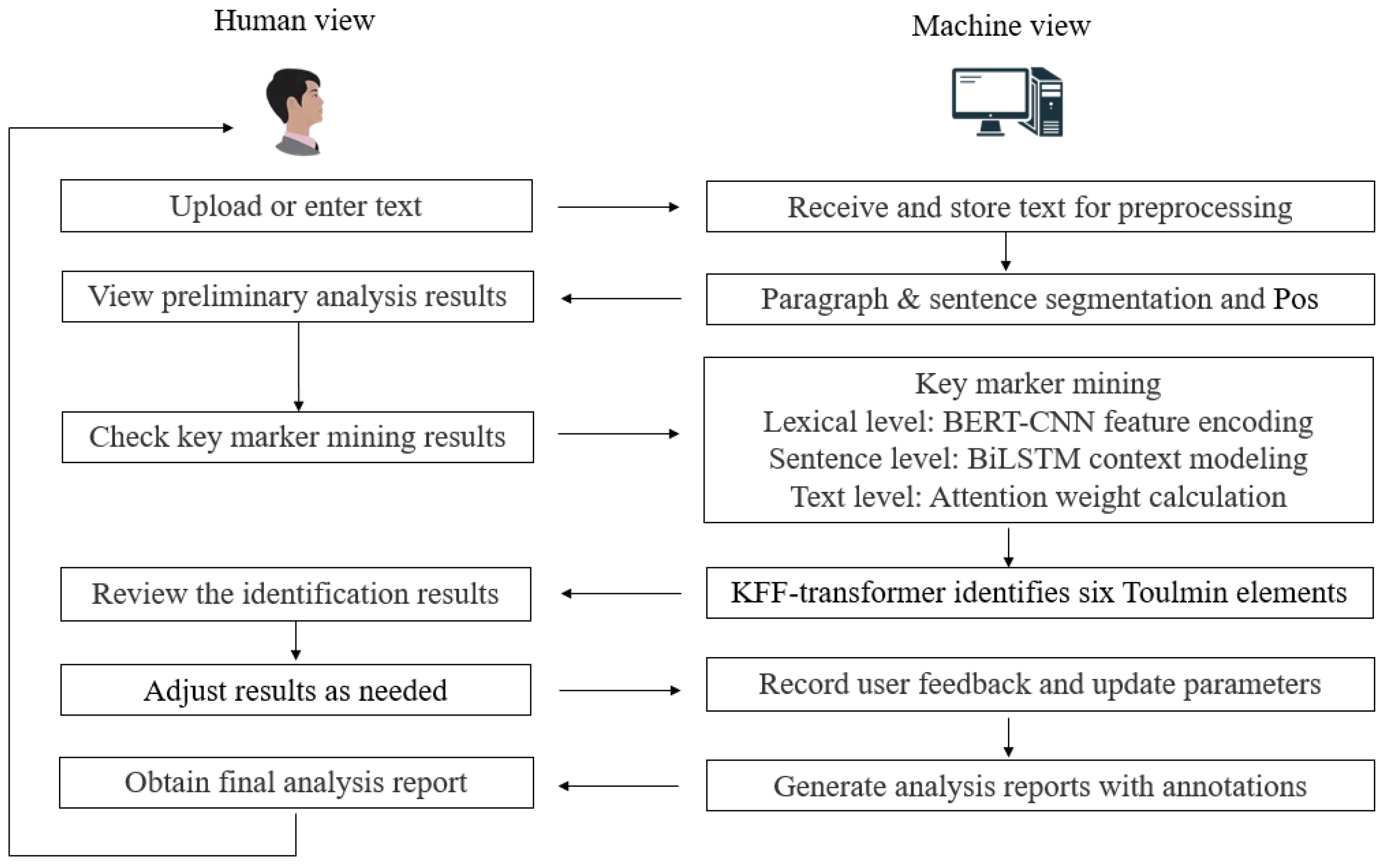 We integrated a deep learning-based architecture that allows users to adjust the parameters or review automatic annotations interactively. The human side shows a simple user journey: uploading text, reviewing results, and making adjustments. The machine side reveals the technical processes: text preprocessing, multi-level feature extraction using BERT-CNN, BiLSTM, and attention mechanisms, followed by a KFF-Transformer identifying Toulmin’s argument elements. The system incorporates user feedback for continuous improvement, combining advanced NLP techniques with human oversight. The HCI flow chart shown in