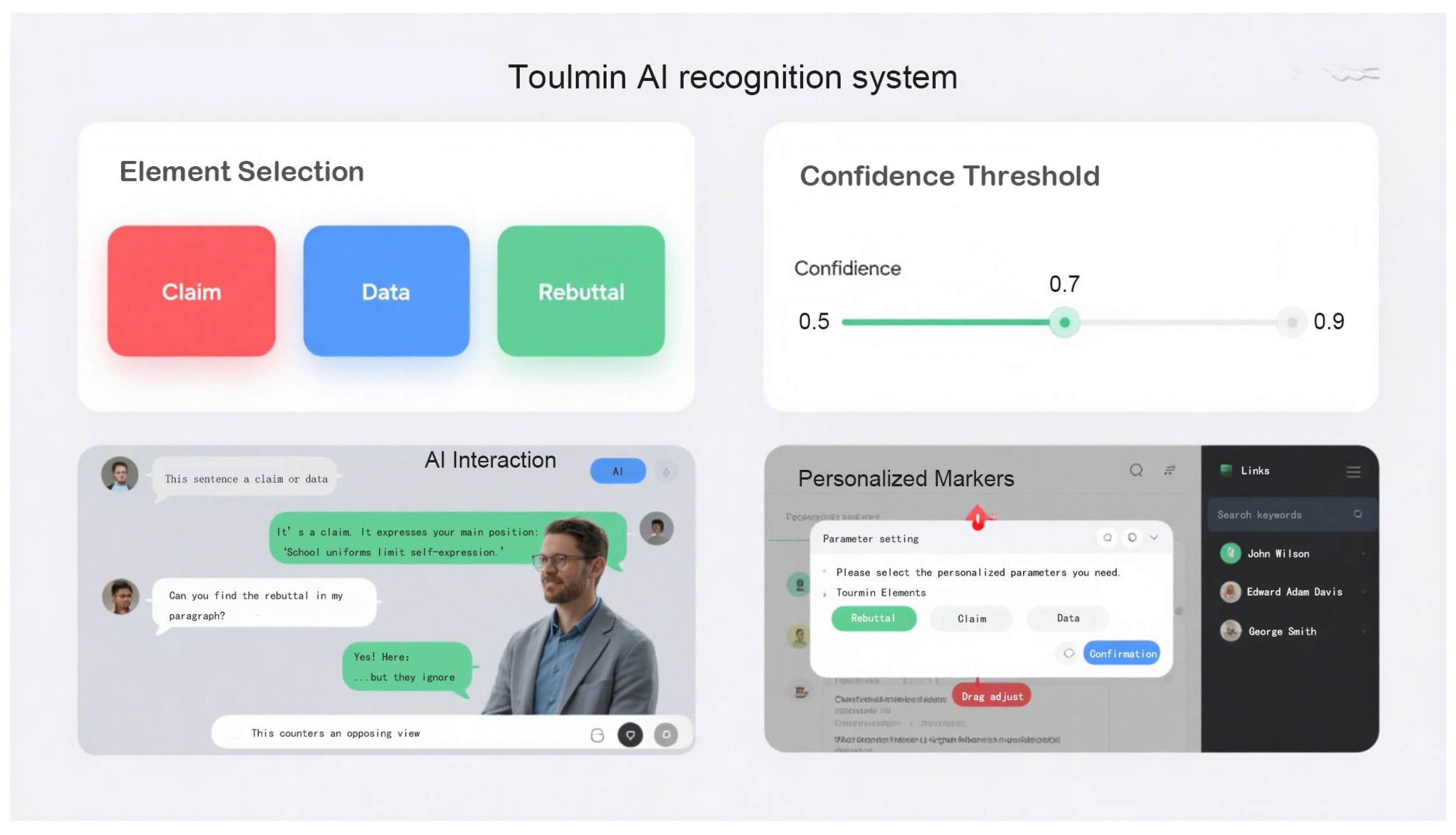 Figure 3 presents the interface of our Toulmin AI Recognition System, featuring four integrated modules designed for collaborative argument analysis. The Element Selection panel (top-left) provides color-coded identification of argument components with red for claims, blue for data, and green for rebuttals. An adjustable Confidence Threshold slider (top-right) allows users to fine-tune annotation sensitivity between 0.5 and 0.9, with a default setting of 0.7. The interactive workspace supports real-time boundary adjustment through draggable selection handles, while the Personalized Markers module (bottom-right) enables custom annotation patterns through an expandable sidebar interface. This unified design supports mixed-initiative interaction by maintaining AI automation while preserving precise human control through intuitive visual encoding and adaptive controls. Notably, the interface is designed for both novice learners (who benefit from guided defaults) and expert instructors (who require granular control), reflecting inclusive design principles in educational technology.