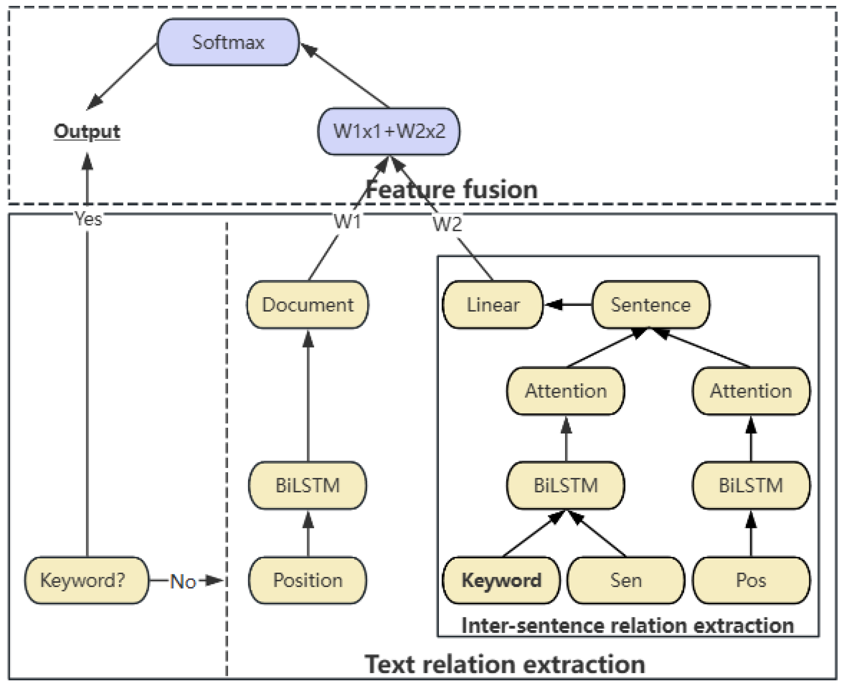 12], a pre-trained Transformer-based language model, to obtain contextualized semantic vectors. “Keyword” represents the key marker, “position” represents the position of each sentence in the text, “x1” is the encoding of the sentence-level text feature obtained through the linear layer, and “x2” is the text feature encoding at the chapter level.