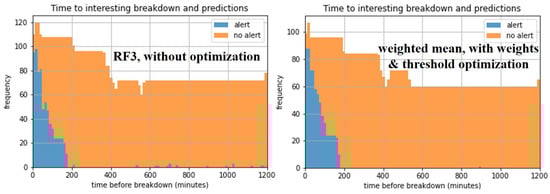 Regarding the modified hyperparameters of RF, the number of estimators was set to ten to avoid excessive computational burden, and this number proved to be sufficient. Both Gini and entropy criteria to measure split quality were tested, but in the end models based on Gini were preferred due to slightly better results. The maximum depth of 20 appeared to correspond to the near–best trade-off between underfitting and overfitting. The classes weights were selected to be balanced due to the severe imbalance of the classes, since in the automotive domain only 1.74% of the timestamps during operation (that is, not corresponding to a stop) are at a distance from an upcoming failure less than 2 h, which is the considered forecasting horizon based on the needs of the industry. Finally, the random state was set to zero, in accordance with the logic used with respect to IF. For the other hyperparameters, the default settings mentioned in the library documentation were considered (minimum number of samples required to split an internal node = two, minimum samples required to be at a leaf node = one, minimum weighted fraction of the sum total of input samples weights required to be at a leaf node = zero, number of features to consider when looking for the best split = square root of all features, unlimited leaf nodes for tree growing in best–first fashion, node split whenever impurity does not worsen, bootstrap, no out-of-bag samples, no warm start, no pruning, all samples used for each base estimator training, no monotonicity constraints etc.).