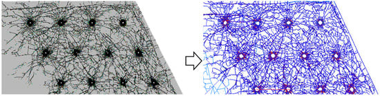 At present, the simulation methods for rock blasting fragmentation can be classified into three major categories [1,2,3]: continuous simulation methods based on continuum mechanics (FEM, BEM, etc.), discontinuous methods based on Newtonian mechanics (DDA, DEM, etc.), and coupled continuous–discontinuous simulation methods (SPH-FEM, FDEM, etc.). Continuous simulation methods, due to their inherent numerical stability in calculation, usually take less computing time than the other two methods; they are stable and can achieve good simulation results for far-field blasting (Figure 1), but they lack a quantitative description of the generation or propagation of cracks during blasting. The advantage of discontinuous simulation methods is that they can provide a better phenomenological effect in simulating blasting [4,5,6], but their disadvantage is that the computing time is much longer than that of continuous medium simulation methods. The stability and accuracy of the mechanical indicators obtained are not ideal, especially in terms of stress, velocity, and acceleration time histories. This method has obvious advantages in simulating blasting fragmentation and crack propagation (Figure 2), but its accuracy largely depends on the sizes of the elements or blocks and the setting of contact parameters.
