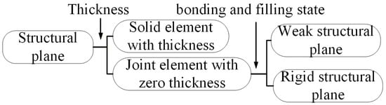 Section 2.2 describes the failure process of the joint elements in detail, but it should be noted that these joint elements inserted between each triangular element are not the real joints: they provide possible paths for material fracture after reaching a certain displacement. Therefore, the characterization of the real joints in FDEM is significant. At present, the characterization of the structural planes (fault, joint, fracture, and weak layer) in FDEM is shown in Figure 4. The solid element thickness includes a triangle element and a joint element, which are often used in the simulation of the underlying weak layer. The joint element with zero thickness is used to simulate the real joint only by redefining and changing parameters. According to the bonding and filling states of real joints, the joint element with zero thickness can be divided into a rigid structural plane and a weak structural plane. The rigid structural plane is considered the joint element that has been damaged, while the weak structural plane is considered intact, and its parameter value depends on the situation of the real joint. Thus, the weak structure plane is more suitable for this article.