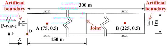 The numerical model of the stress wave propagation across the joint is assumed to be fully elastic as shown in Figure 6. Point O is the origin of the coordinates. The model is 300 m long and 1 m wide, and the joint is located in the middle part. A half-sinusoidal P-wave with a frequency of 20 Hz and a peak velocity of 1 m/s is normally applied at the left end of the model. Absorbing boundaries are placed at the left and right ends to avoid wave reflections from the boundaries. Due to a normally incident P-wave, displacements in the y-direction of the upper and lower boundaries are restricted, and the x-direction is free. Incident, reflected, and transmitted waves are obtained from the velocity histories of monitoring points A (75, 0.5) and B (225, 0.5). The present study focuses on the effect of the joints on the propagation of stress waves and does not consider the attenuation caused by rock materials. Normal joint stiffness is varied from 5 × 107 to 5 × 109 Pa/m to achieve different normalized normal stiffness varying from 0.049 to 4.989. The magnitude of the transmission (reflection) coefficient is defined as the ratio of transmitted (reflected) wave peak velocity to incident wave peak velocity.