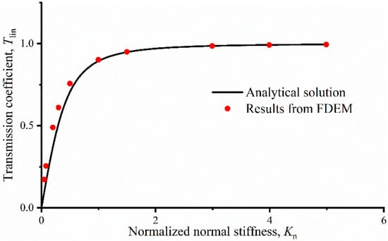 The velocity histories at measurement points A and B for P-wave propagation across a single linearly deformational joint with different normal joint stiffnesses are presented in Figure 7a,b. The transmission coefficients assessed by FDEM and the theoretical expression of the P-wave with different normal joint stiffnesses are presented in Figure 8. According to above figures, we can ee that the transmission coefficients assessed by FDEM agree well with the results from the analytical solution.