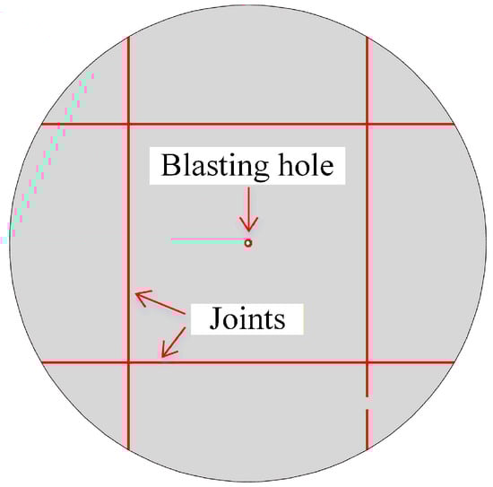 A rock mass blasting model (Figure 11) is established, with a length of 16 m and a height of 7 m. The borehole radius R0 is 0.05 m, and the center coordinate of the borehole is O (0,0), with a minimum resistance line distance of 2 m. The model contains 8950 triangular elements and 13,542 no-thickness joint elements. The initial peak pressure of the explosive gas P0 is set at 1 GPa, the explosive gas vp diffusion velocity is 100 m/s, and the constant γ related to the properties of the explosive and rock is 1.4 [20,26,27].