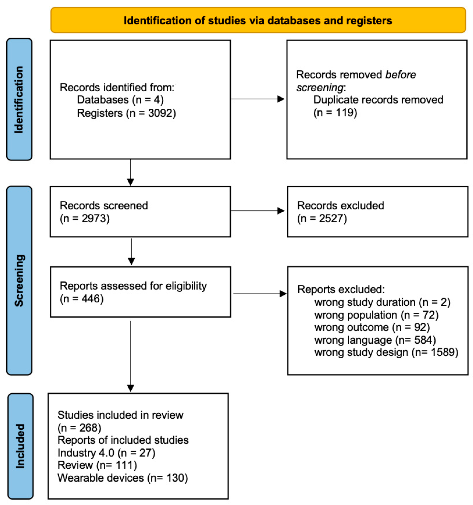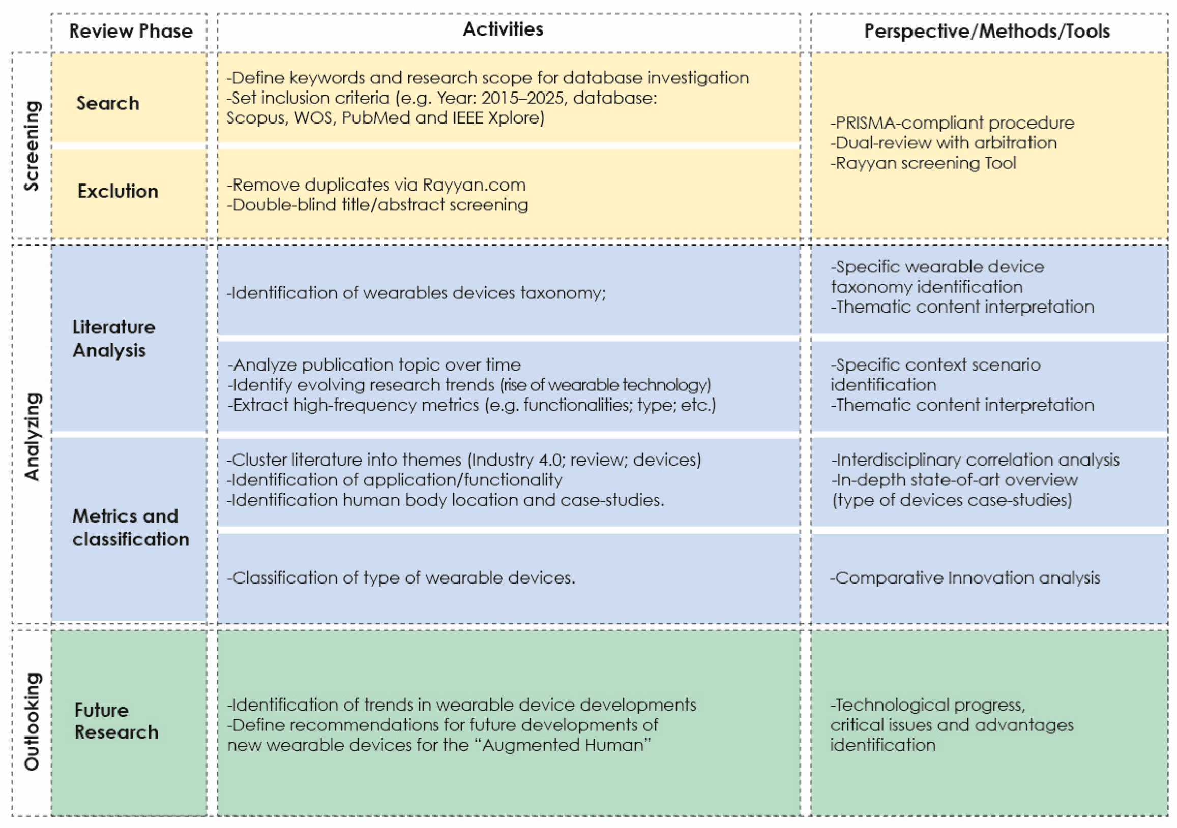 Specifically, the final collection of acceptable studies was then selected through a comprehensive review of the articles. The variables to be extracted were decided using a data extraction form. The following elements were included: article identifiers (authors, year of publication); study identifiers (context, technologies, applications); parameters included for analysis (scoping review; trials; comparison and classification). From the qualitative analysis of the studies identified, the main wearable devices used in industrial contexts were selected and classified by functionality and type.