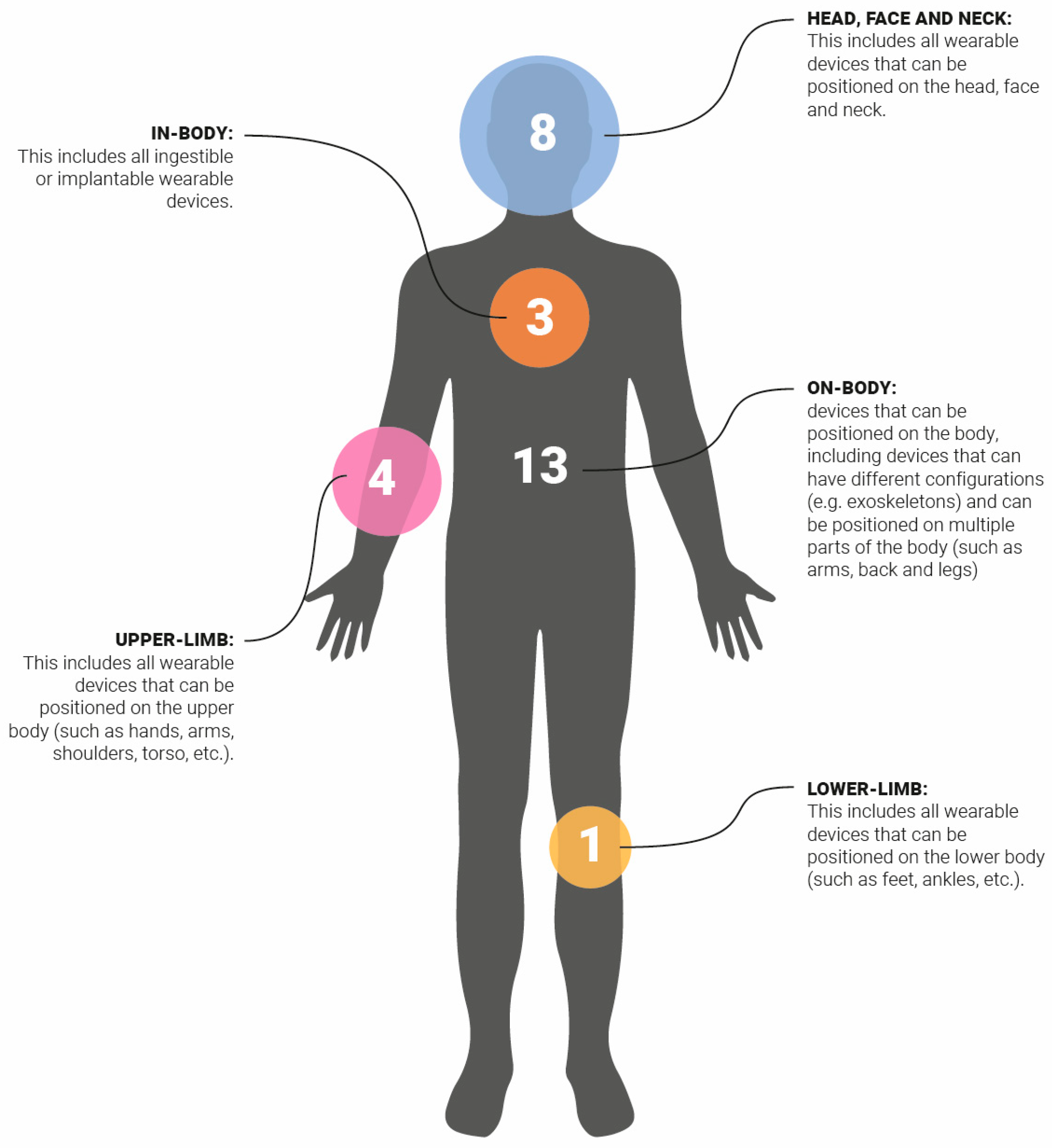 All types of devices that are worn on one or more parts of the body can be classified as on-body devices. This category includes tactile suits; location devices; personal notification devices; safety buttons; smart tattoos; wearable cameras; body movement monitoring/tracking sensors; wearable robots; e-Skin and smart patches; smart textiles; sensors for monitoring physiological factors; performance monitors; and human behaviour trackers.