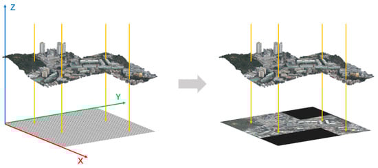 The key prerequisite for the precise individualization of a 3D model is to convert complex spatial information into easily processable 2D data. To this end, this study adopts a method based on orthogonal projection to directly generate a 0.05-m resolution DOM from the oblique photography model [42,43]. As shown in Figure 3, this method first calculates the axis-aligned bounding box of the 3D model to lock the geographic range. Subsequently, an orthogonal projection camera for the scene is constructed within this range. This camera is placed directly above the model’s bounding box with its line of sight strictly perpendicular to the ground plane (Z-axis direction), and the size of its view frustum is set to perfectly cover the entire XY planar extent of the model. Finally, the surface texture colors of the model are projected onto the 2D plane, while areas not covered by the model are filled with black pixels. This process completely eliminates the building geometric distortions caused by viewing angles and terrain that are present in traditional single-view remote sensing images, and ensures that the building contours in the image can be precisely registered with the spatial coordinates of the original 3D model, providing a high-precision data foundation for subsequent building extraction and 3D dynamic rendering.