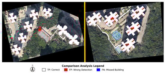 Finally, in some narrow spaces between buildings, oblique photogrammetry models often exhibit geometric “adhesion” due to the physical bottlenecks of multi-view matching algorithms, as shown in Figure 11. These areas appear as connected geometries in the original 3D model, causing the generated orthophotos to also present visually continuous pixel blocks. Although human annotators typically separate these areas based on cognitive experience when creating ground truth labels, this also introduces certain errors. As shown in the segmentation results for some buildings in the preceding Figure 6, the segmentation network tends to faithfully reflect the adhered features in the imagery, identifying the narrow spaces with building adhesion as part of the building itself, which results in inconsistencies with the manual ground truth.