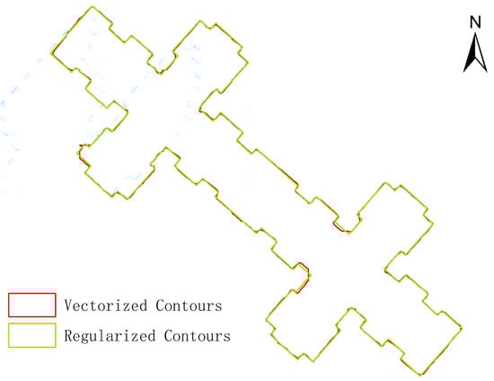 Subsequently, based on the geographic transformation matrix of the original image, the pixel coordinates in image space are accurately mapped back to geographic space coordinates through an affine transformation. To address the jagged edges inherent in raster segmentation, an orthogonal geometric regularization algorithm based on least-squares optimization can be further introduced. It is crucial to note that this process is implemented under strict precision control. Utilizing the regularization toolchain of ArcGIS Pro (version 3.0.1), explicit Simplification Tolerance and orthogonality weight constraints are preset to forcibly reconstruct irregular pixel edges into regularized vector polygons that conform to the right-angled morphological characteristics of buildings. This parameter-controlled constructive process provides an intrinsic guarantee for the geometric regularity of the final output at the algorithmic level.
