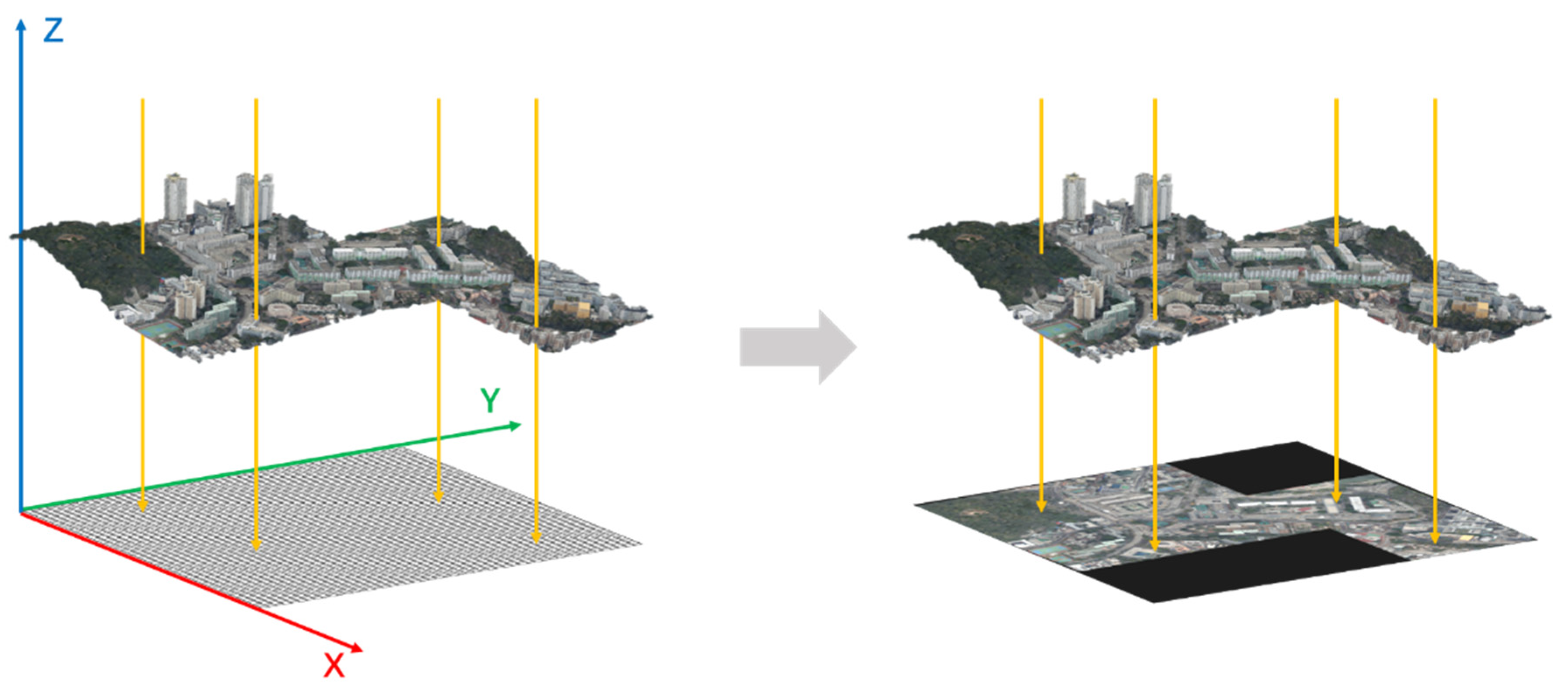 - Chen, S.; Yan, Q.; Qu, Y.; Gao, W.; Yang, J.; Deng, F. Ortho-NeRF: Generating a True Digital Orthophoto Map Using the Neural Radiance Field from Unmanned Aerial Vehicle Images. Geo-Spat. Inf. Sci. 2024, 28, 741–760. [Google Scholar] [CrossRef]
