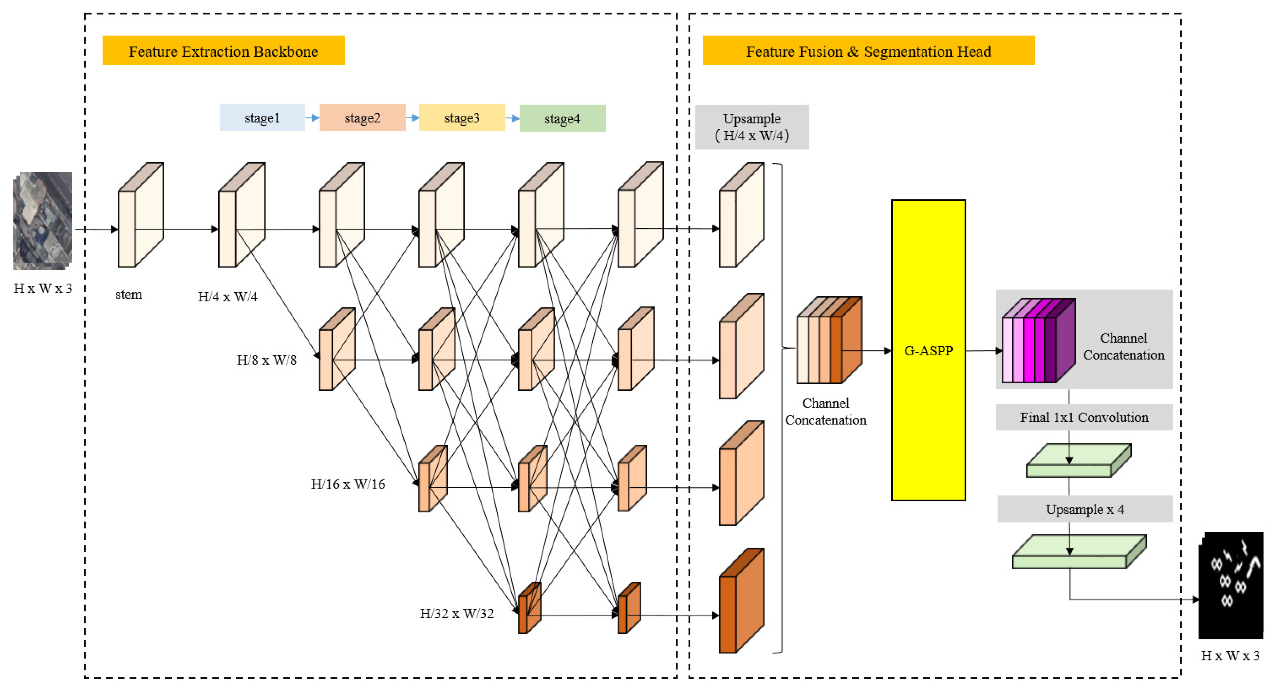 | DeepLabV3+ [41] | Atrous Spatial Pyramid Pooling (ASPP) | Expands receptive field to capture multi-scale context | Prone to spatial information loss and difficult to adapt to complex scale variations in ultra-high-resolution orthophotos. |