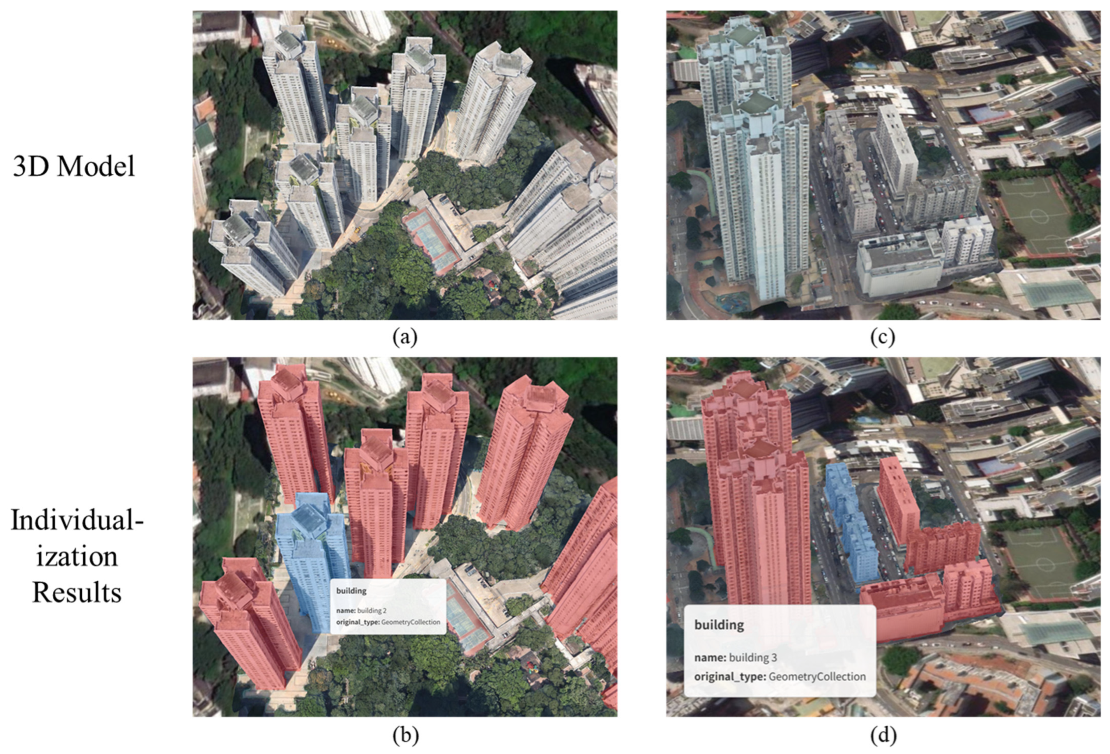 - Established an end-to-end framework for building individualization from oblique photogrammetry models. The framework integrates orthophoto generation, deep learning-based segmentation, and coordinate-based 3D mapping with interactive visualization, providing a practical solution for large-scale urban 3D model applications that avoids the geometric complexity of direct 3D segmentation.