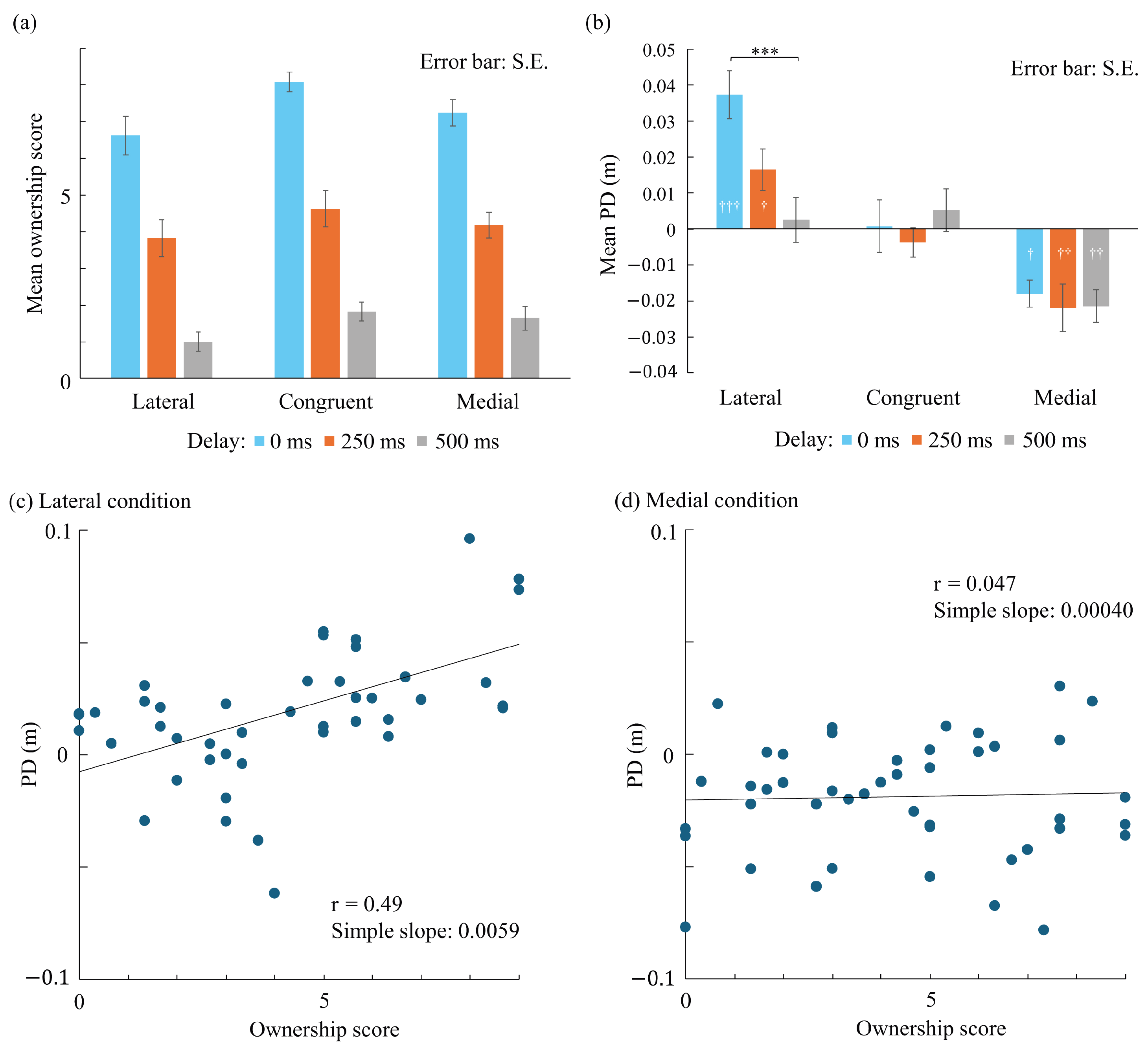 | Position × delay (250 ms) × ownership | 0.0095 | [−0.016, 0.035] | 0.74 | 78 | 0.46 |