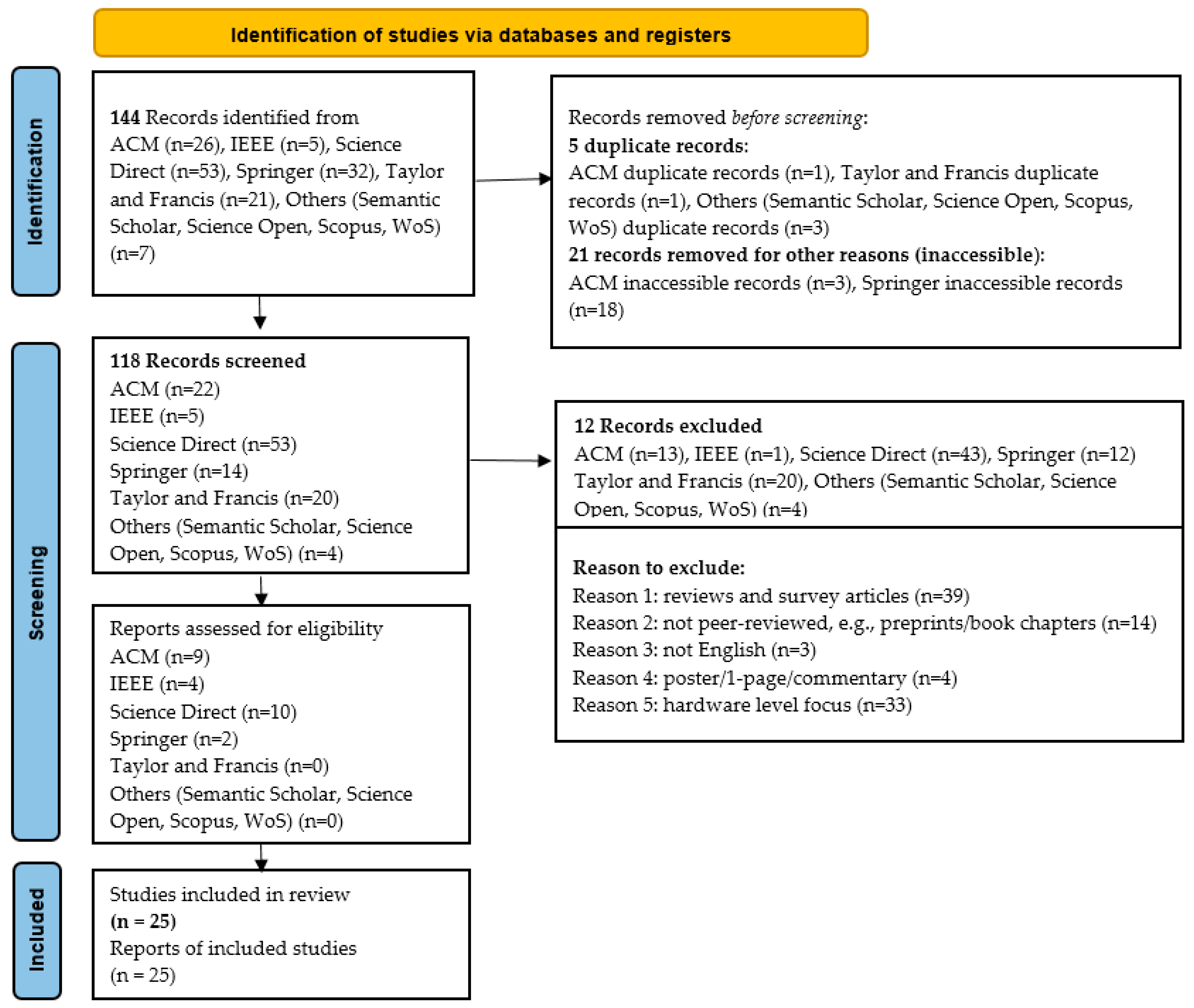 | Automation and AI [19,21,26,28,29,31,38,39] (32%, n = 8) | Overcome manual review difficulty | [19,21,31,39] | 4 | 16% |