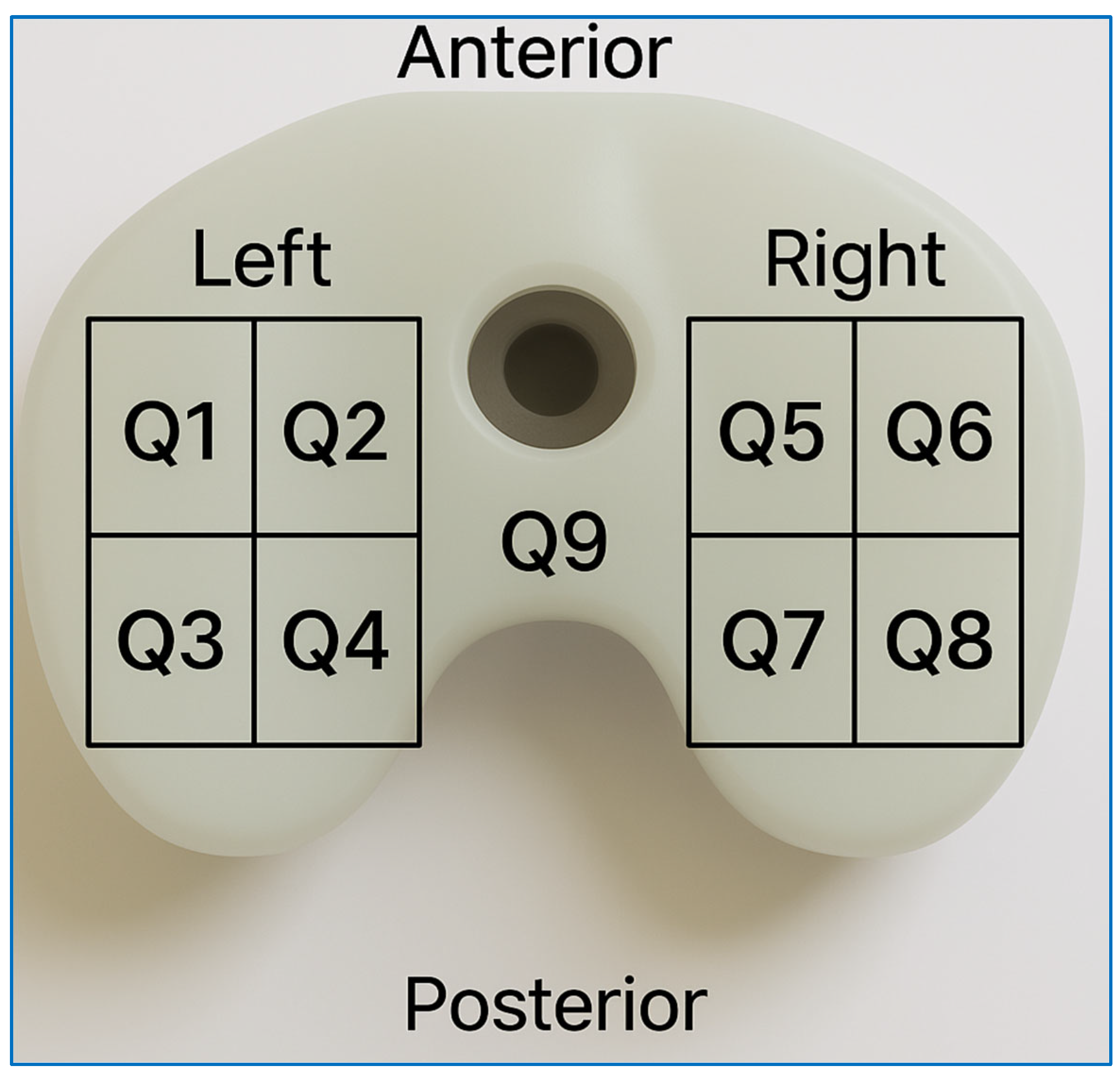 The quantitative distribution of surface damage features across the nine predefined anatomical quadrants (Q1–Q9) for each retrieved knee liner is performed and noted in