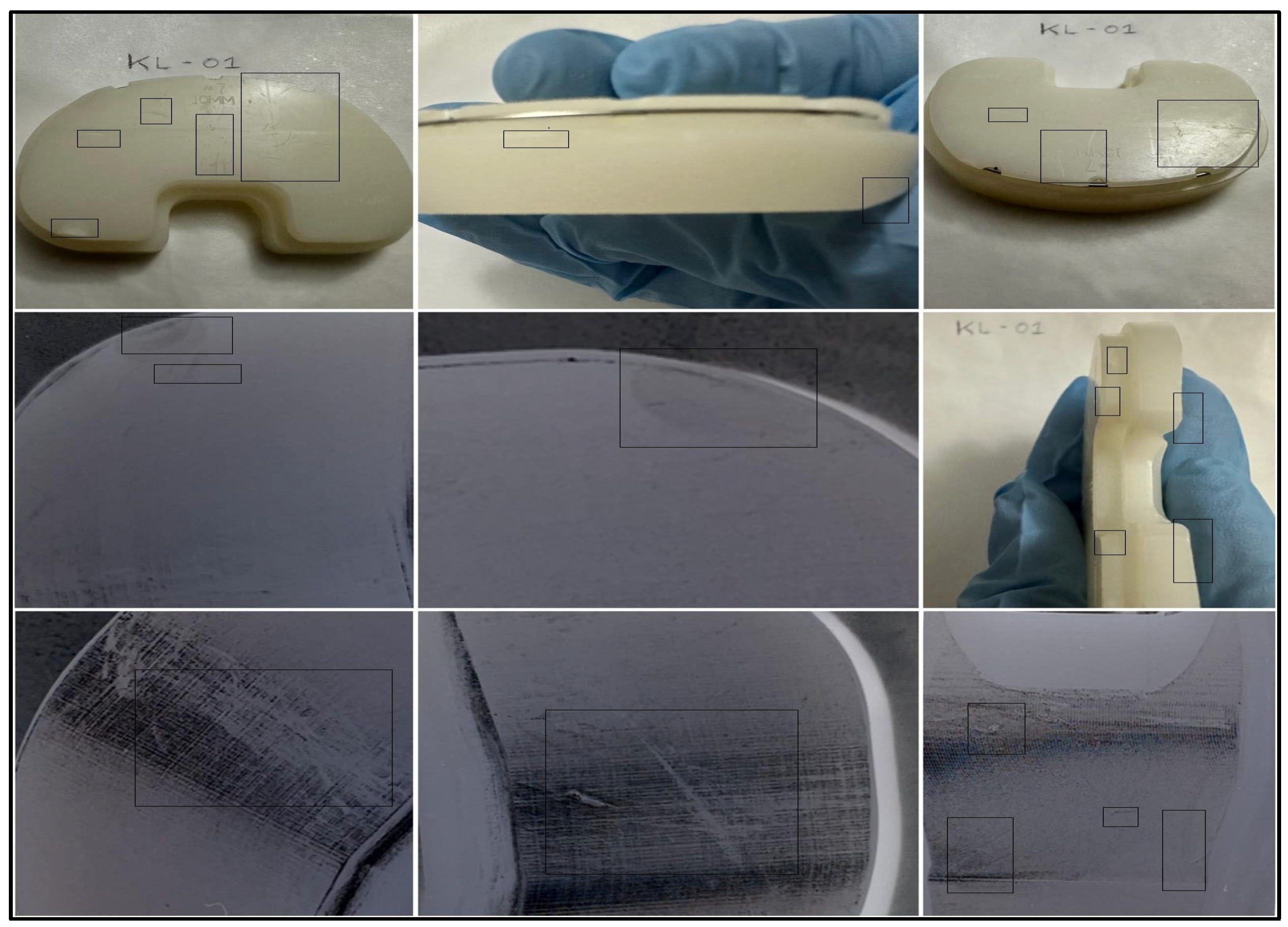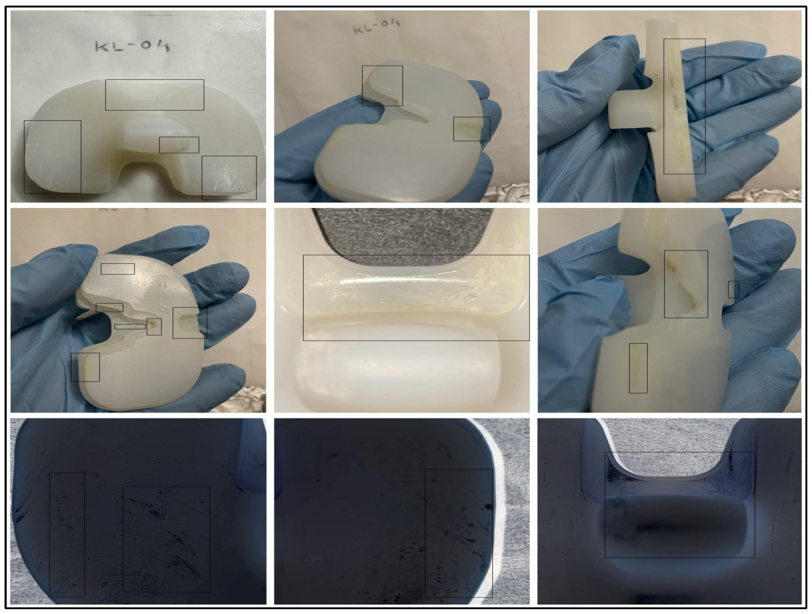 While the research provides important information regarding surface wear and failure modes of UHMWPE knee liners in TKA surgery, there are certain limitations of the research that need to be mentioned. First to be noted is that five knee liners (KL-1 to KL-5) limited the sample, and they may not represent the entire spectrum of failure modes or of the different types of implants. In addition, patient-related variables such as age, activity level, implant age, body mass index (BMI), and surgical alignment information were unavailable, limiting the correlation of wear patterns with clinical outcomes [