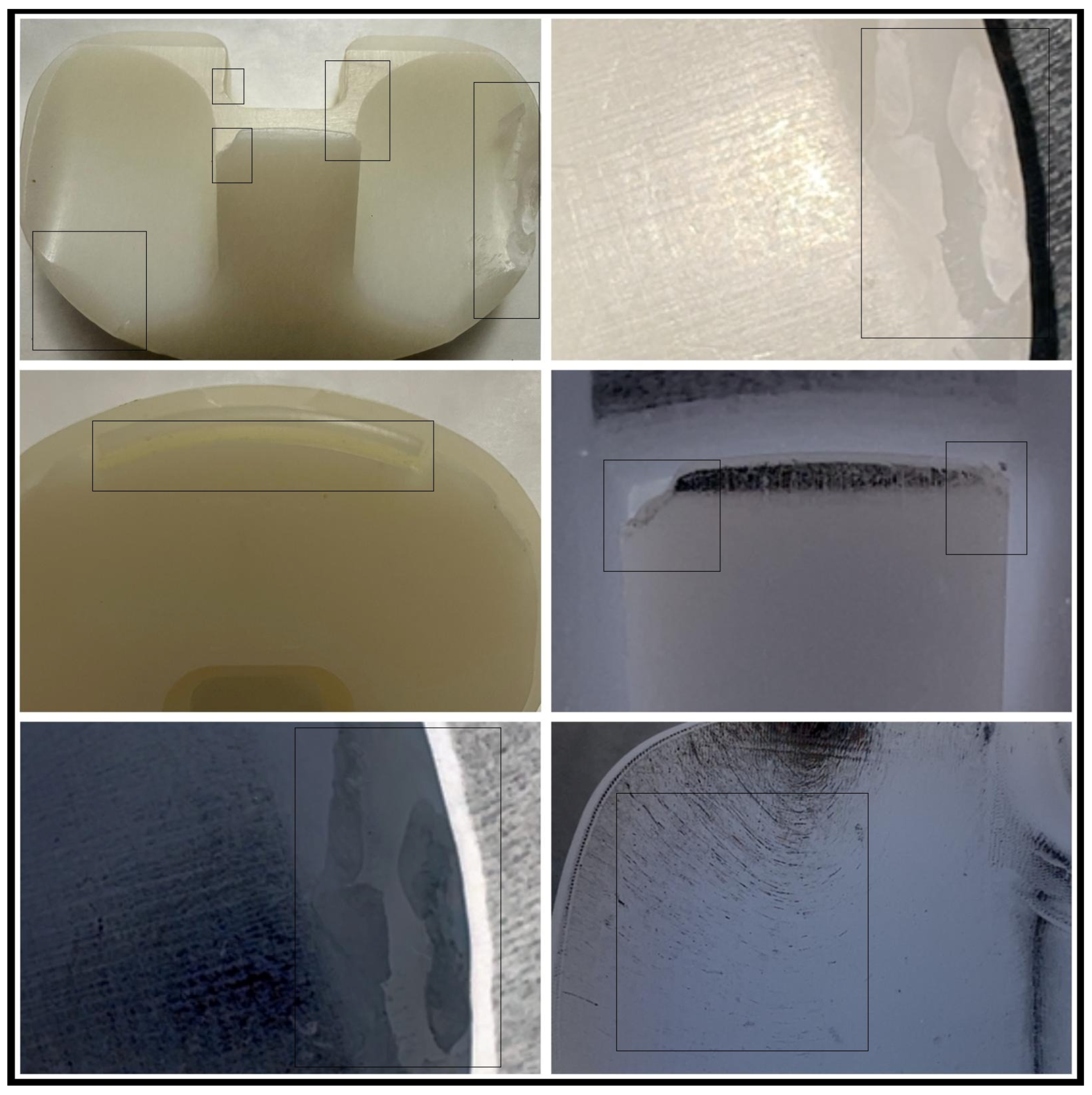 This study has several limitations. The small sample size (n = 5) limits statistical power and restricts the generalizability of the findings to broader patient populations and implant designs. Additionally, mechanical testing and chemical characterization of the liners were not performed; therefore, the conclusions are based on surface-level damage assessment, rather than direct measurements of material properties such as hardness, oxidation, or fatigue resistance. The absence of detailed patient-specific data, including activity level, body mass index, implantation duration, and clinical outcome scores, further limits the direct correlation between wear patterns and patient outcomes.