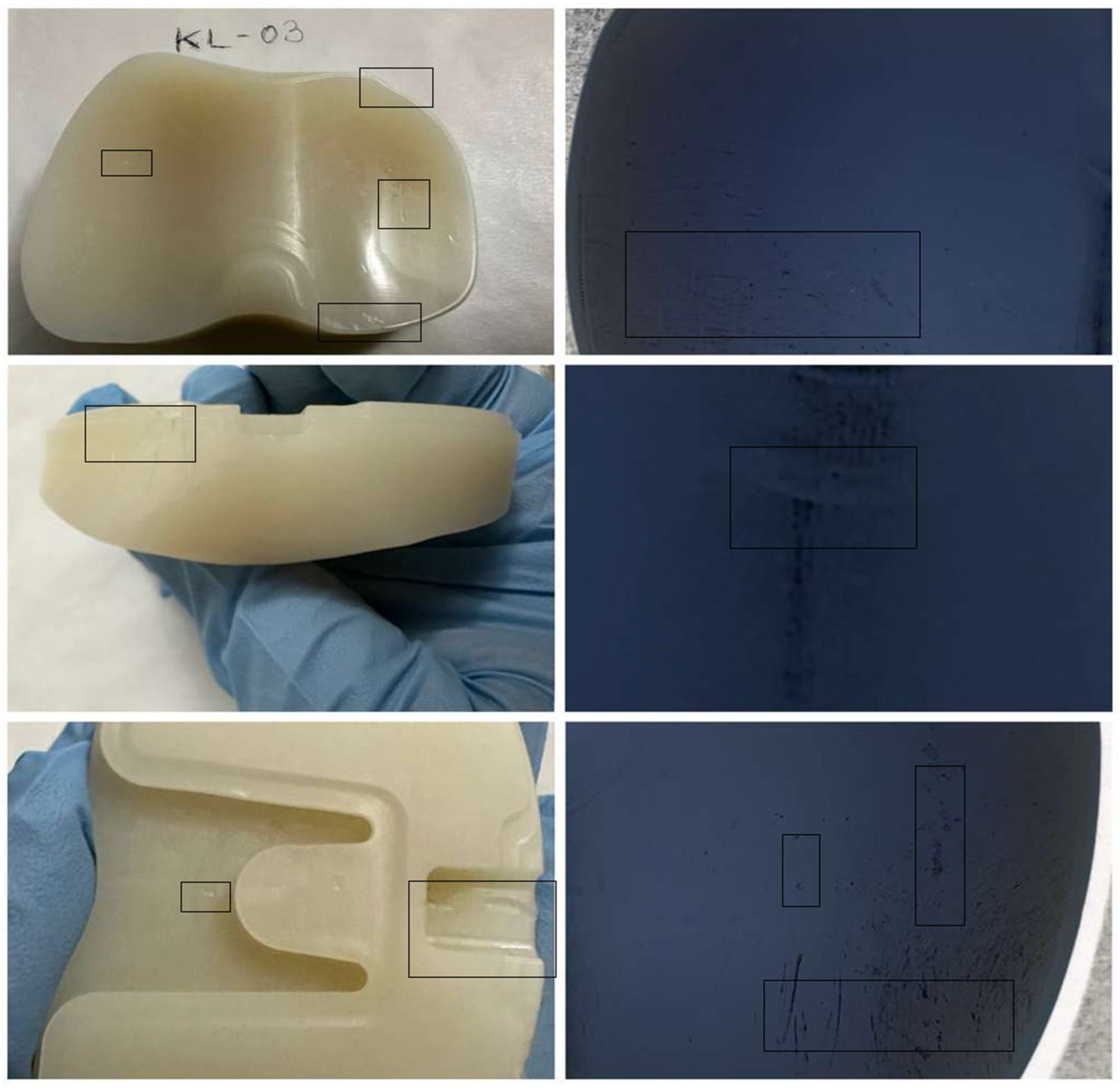 Table 6, focusing on the relative severity of scratches and pits. In addition to total counts, the table identifies the presence of deep scratches and clustered pits, which are indicative of advanced wear and fatigue-related damage. This qualitative assessment complements the quantitative defect counts by highlighting differences in damage intensity and complexity among the liners, thereby offering further insight into the progression of wear mechanisms associated with implant design and in vivo loading conditions.